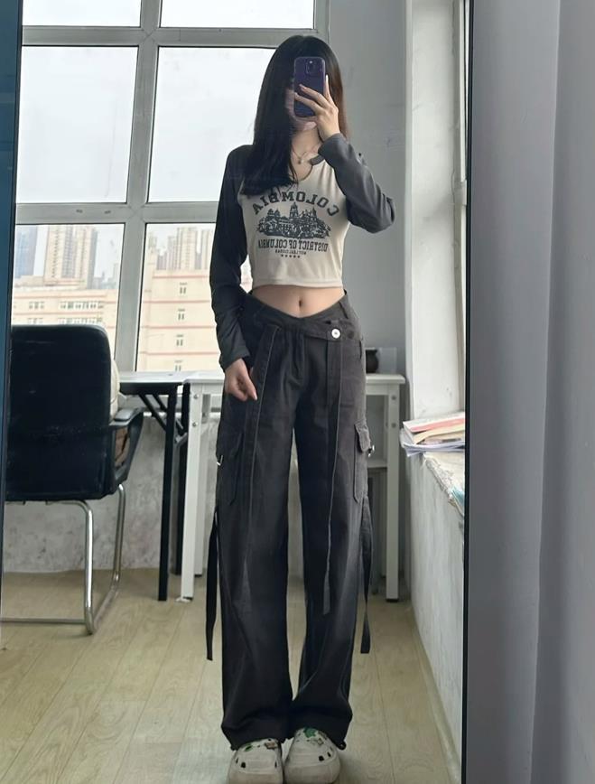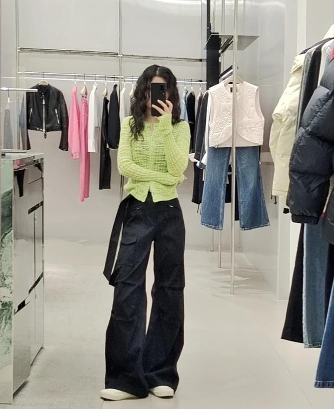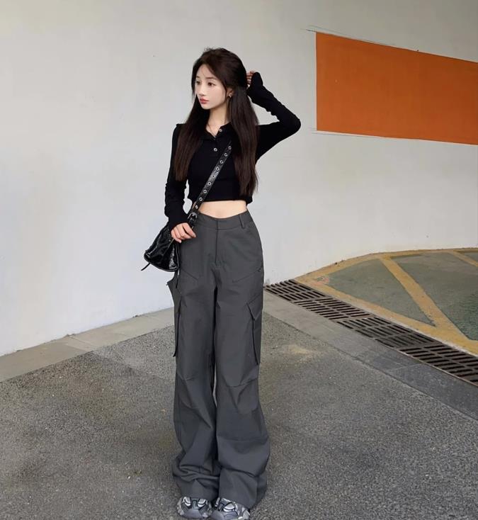 最近真的被這條工裝闊腿褲帥到了,褲子的顏色是高級灰,很百搭時髦,搭配短上衣的話,下身的比例線條就被拉長了。顯高挑和顯腿長都不是問題。
