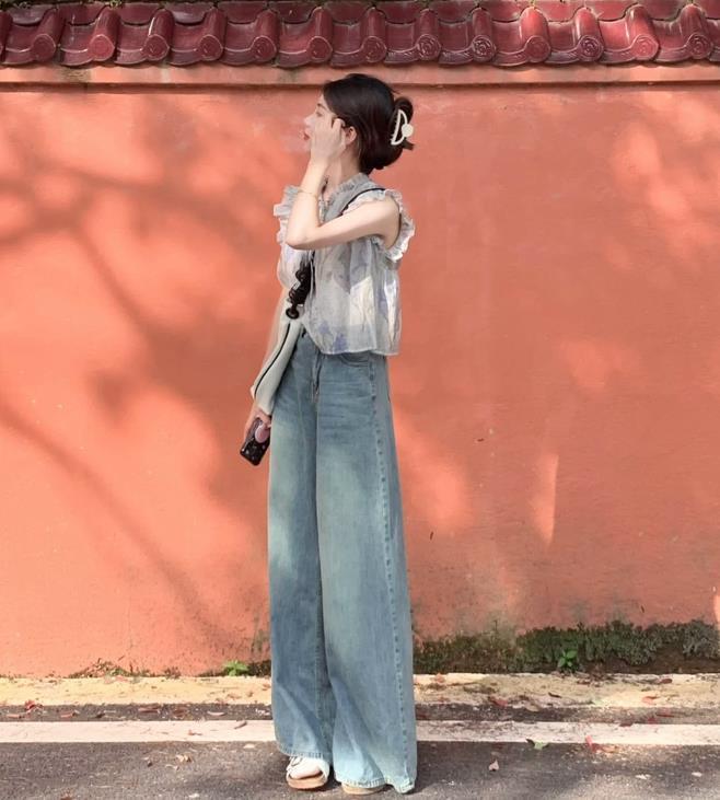 這條牛仔闊腿褲實在是太好看了,經典百搭的款式,加上清爽的牛仔藍色,超級好搭配衣服的。上衣的選擇沒有上限,配t恤、襯衫、背心都可。