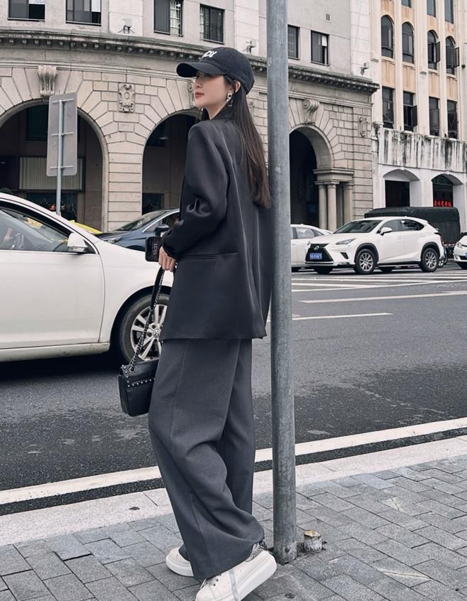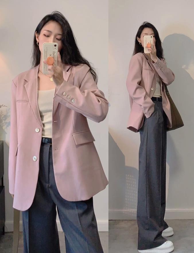 極簡清冷的高級感,適合職場通勤,粉灰色的西裝外套,一點都沒有想象中的俗氣和土,反而是透着質感和高級。搭配灰色西裝闊腿褲,簡約隨性的氣質。