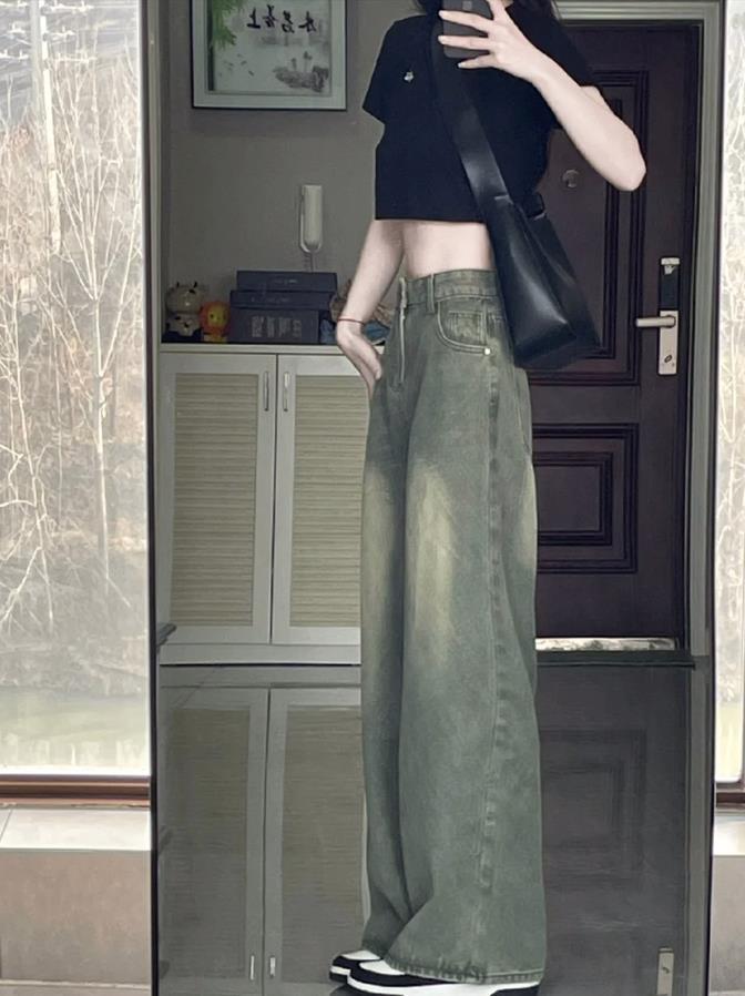 牛仔材質的闊腿褲,質感和垂墜感都是非常不錯的,寬鬆的版型,很好遮掩起胯寬大腿粗的缺點。做舊的綠色,更多了幾分復古氣息,高腰+拖地的長度,誰穿誰顯腿長。