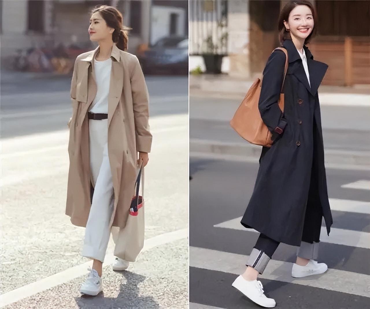 春天裏的白色板鞋,與長款的風衣外套也是絕配,我們可以用平底的板鞋來搭配九分的闊腿褲,搭一件寬鬆的風衣又酷又美。