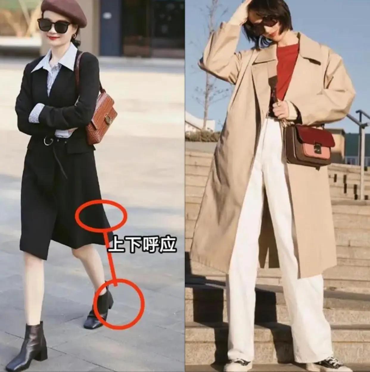 色彩上的呼應,可以給人一種高級美。比如我們穿黑色風衣,可以搭配及踝的短靴來穿着,時髦洋氣的組合,給人一種驚豔大氣的美。