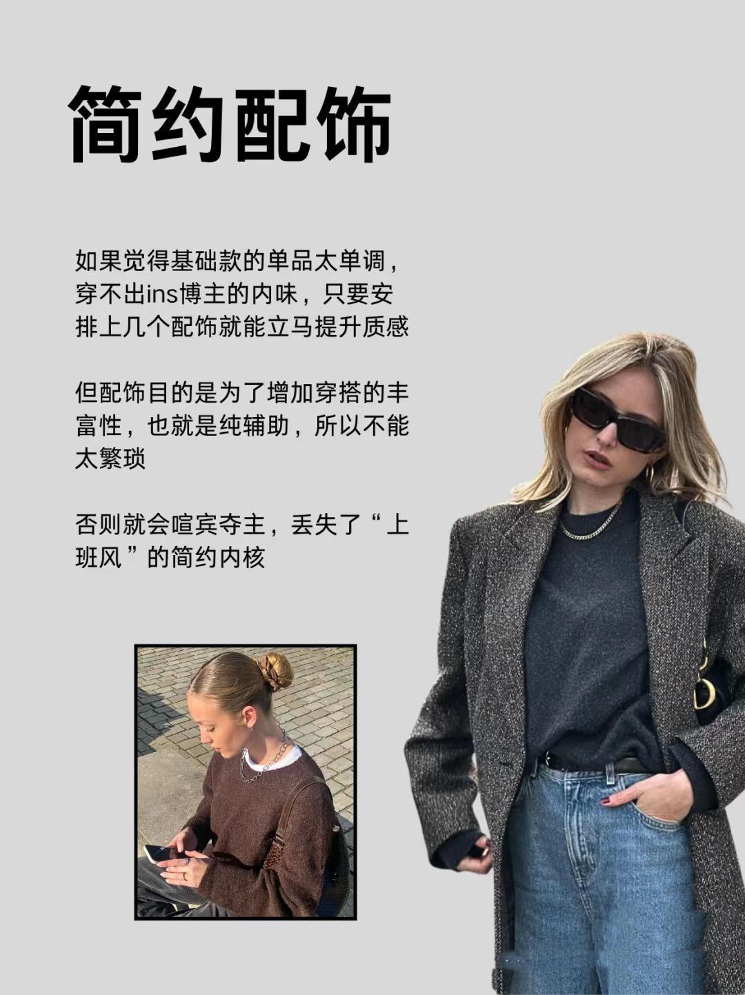 配飾的增加是爲了豐富穿搭層次,也就是輔助性,所以選擇配飾的時候不要太過雜亂,一般全身配飾不應該超過3種,否則就會喧賓奪主,顯得太過浮誇了。