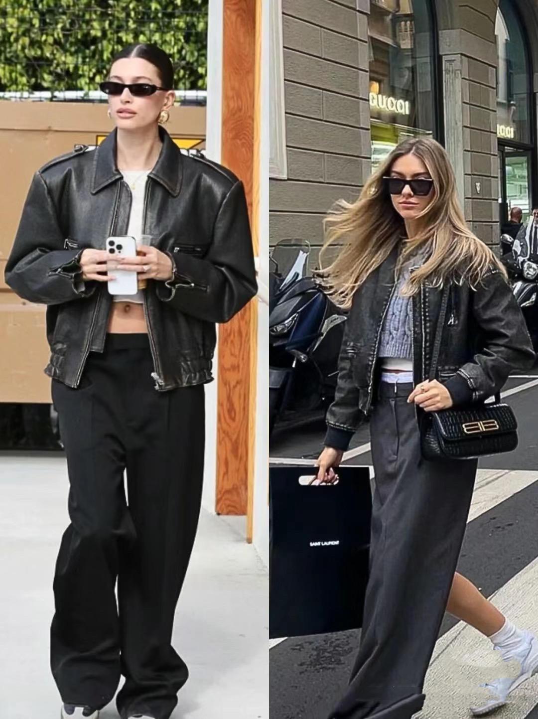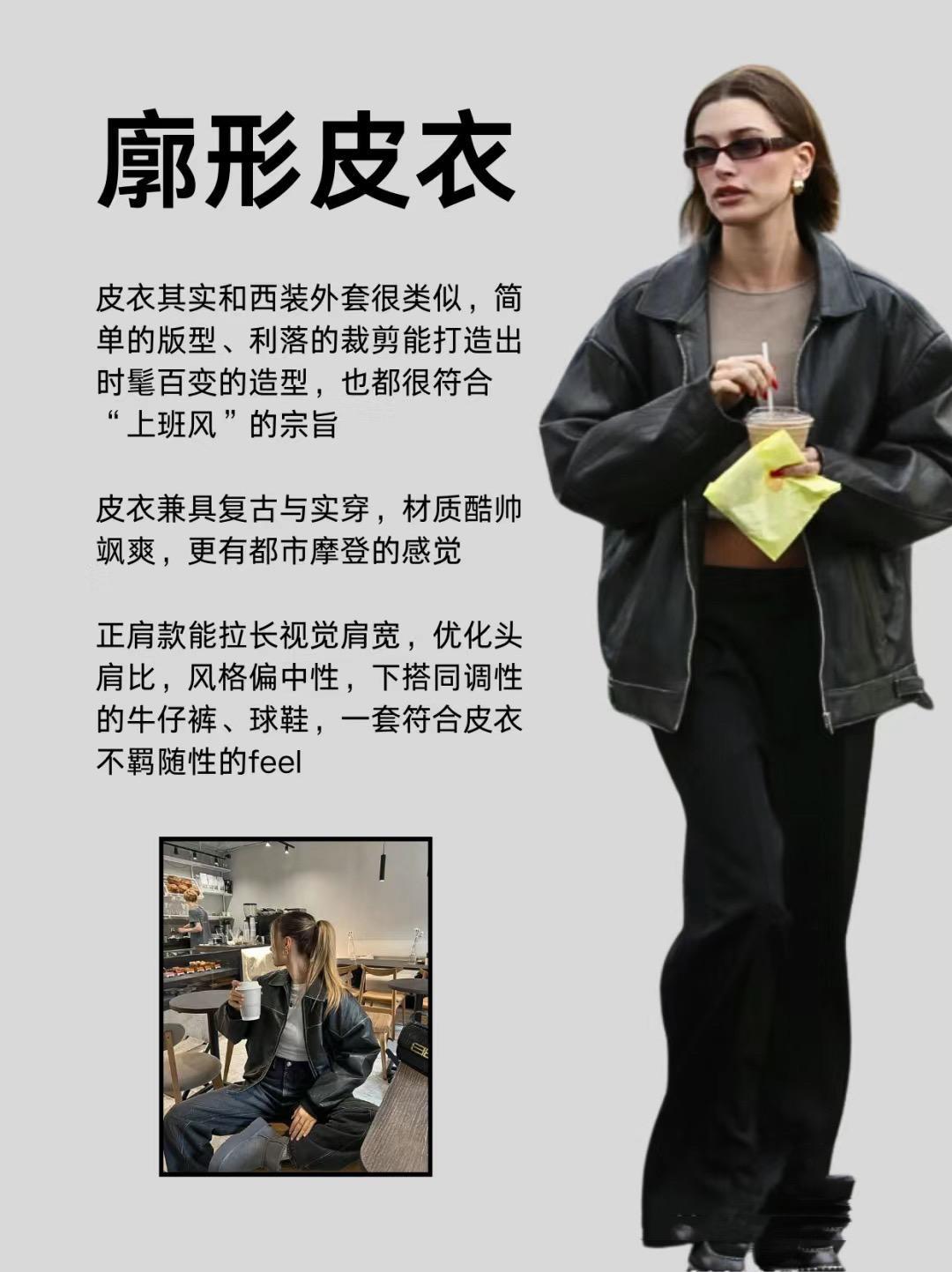 皮衣外套兼顧了復古感與實穿性,皮革面料的材質更加酷帥颯爽,隨便一穿就具備了都市摩登女郎範。我們可以選擇正肩款的皮衣外套,優化頭肩比例、風格偏中性,塑造出隨性不羈的feel。