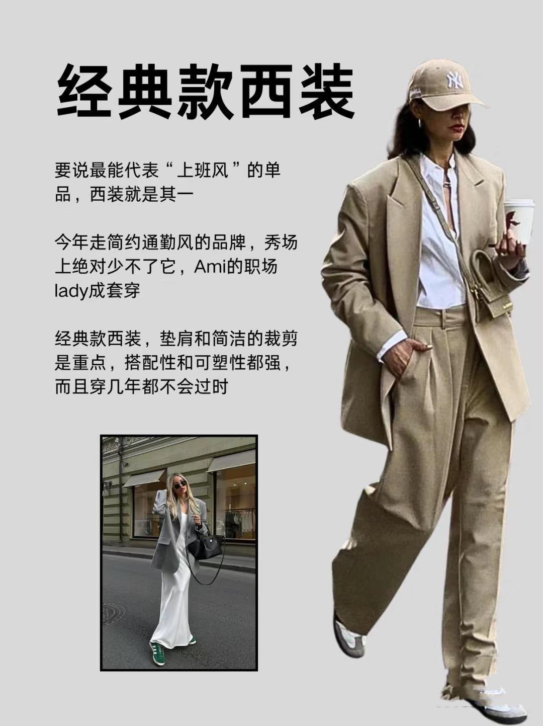 稍微寬鬆一點的經典款西裝外套,包容性更強。即便是走簡約通勤風、時髦女神風,都可以選擇它。經典款西裝,利落的墊肩、流暢的剪裁,可搭配性與可塑性都更強,屬於穿幾年都不會過時的款。