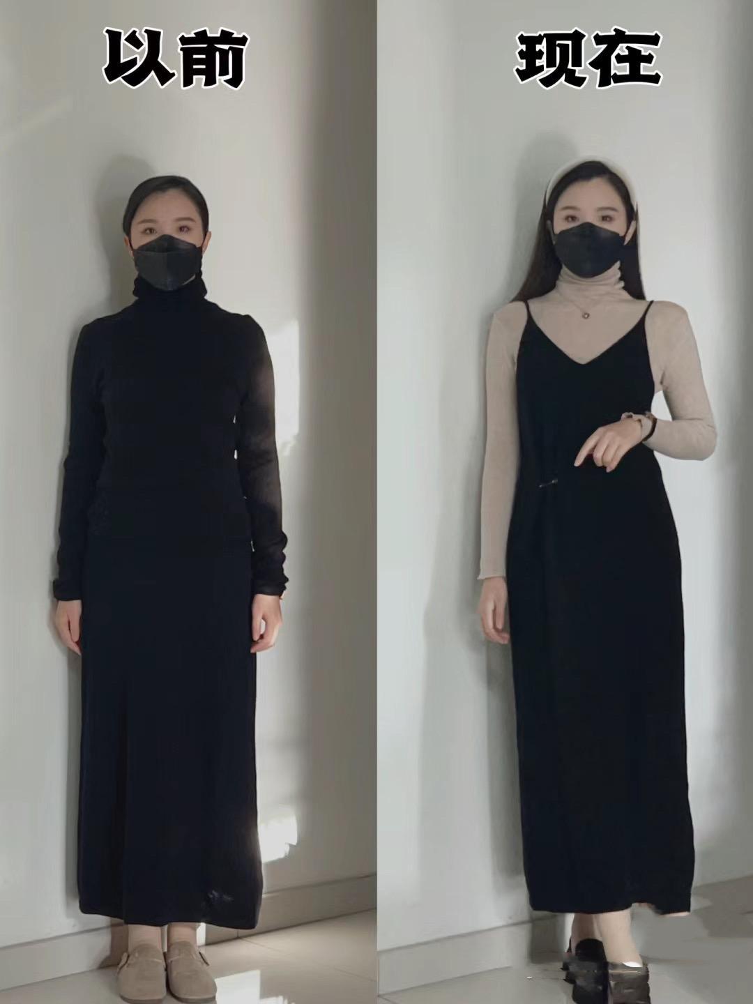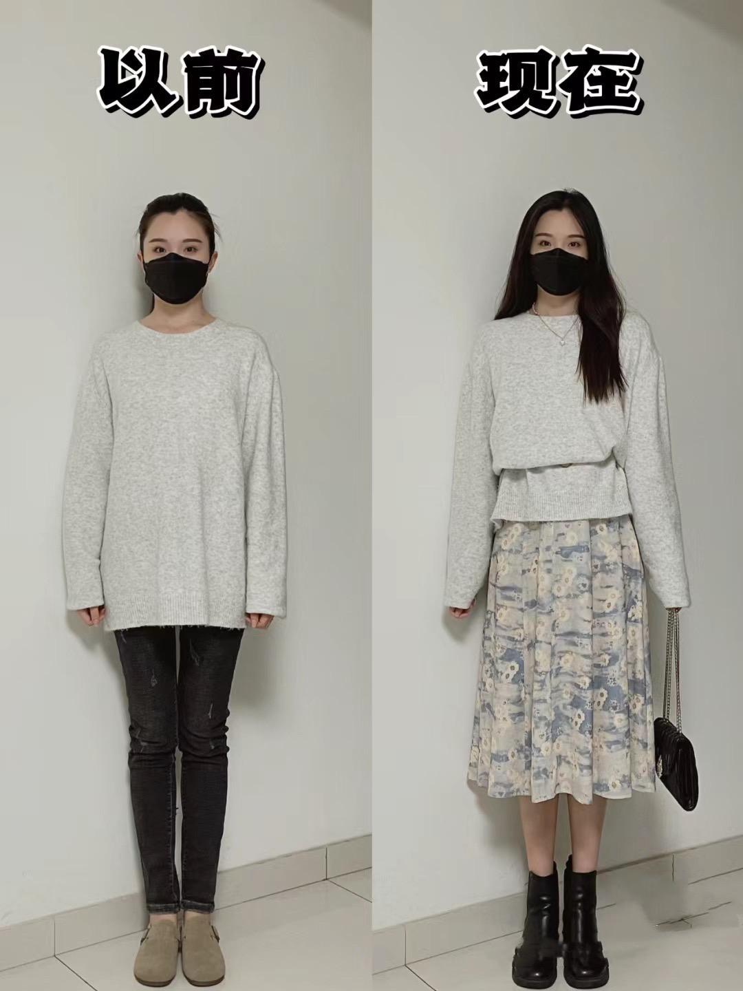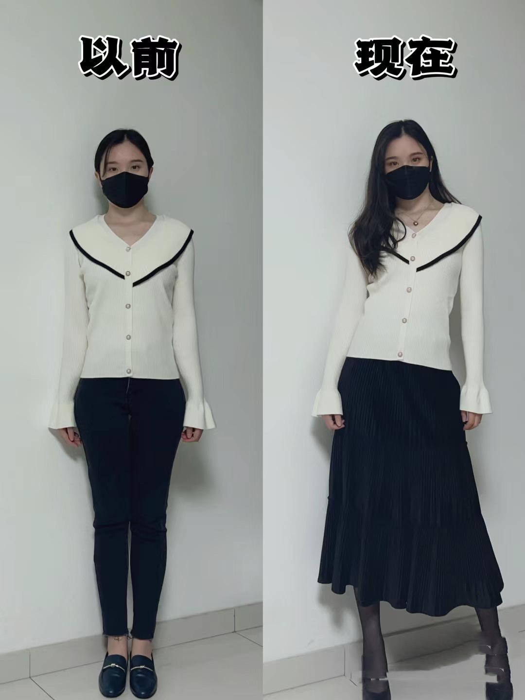搭配後則是從自己的體型出發,學會了揚長避短。雖然還是同一件白色針織衫,但是將下身的小黑褲換成了高腰的A字形半身裙,分明優雅浪漫了起來,遮胯的同時顯得小腿更纖細。