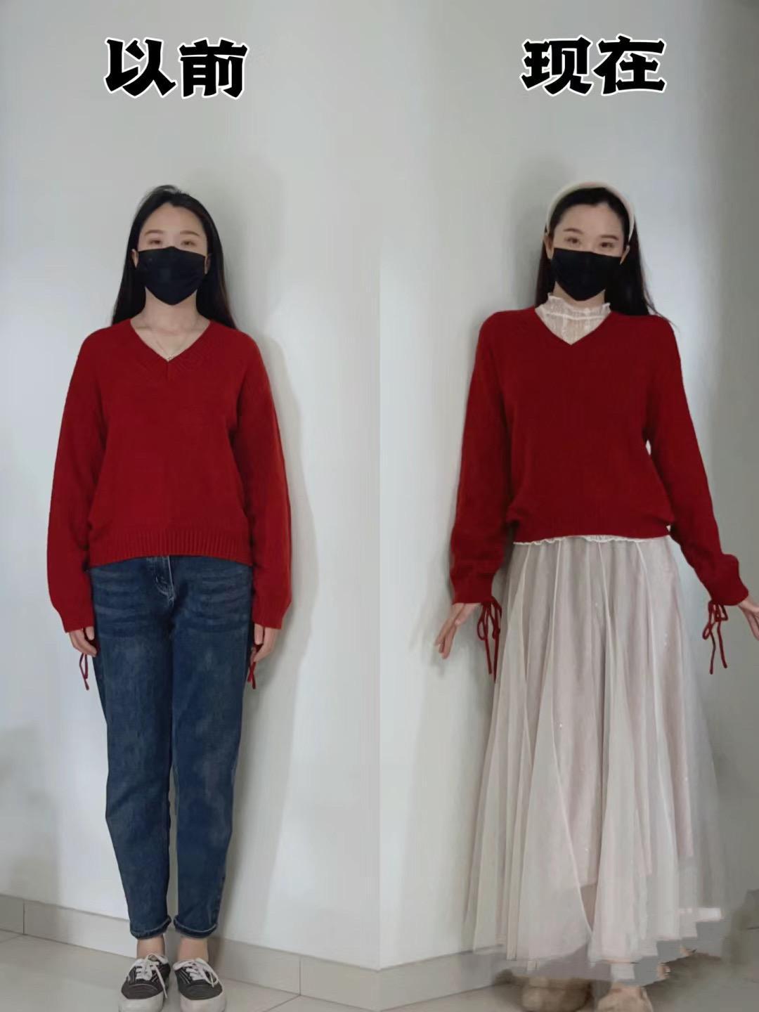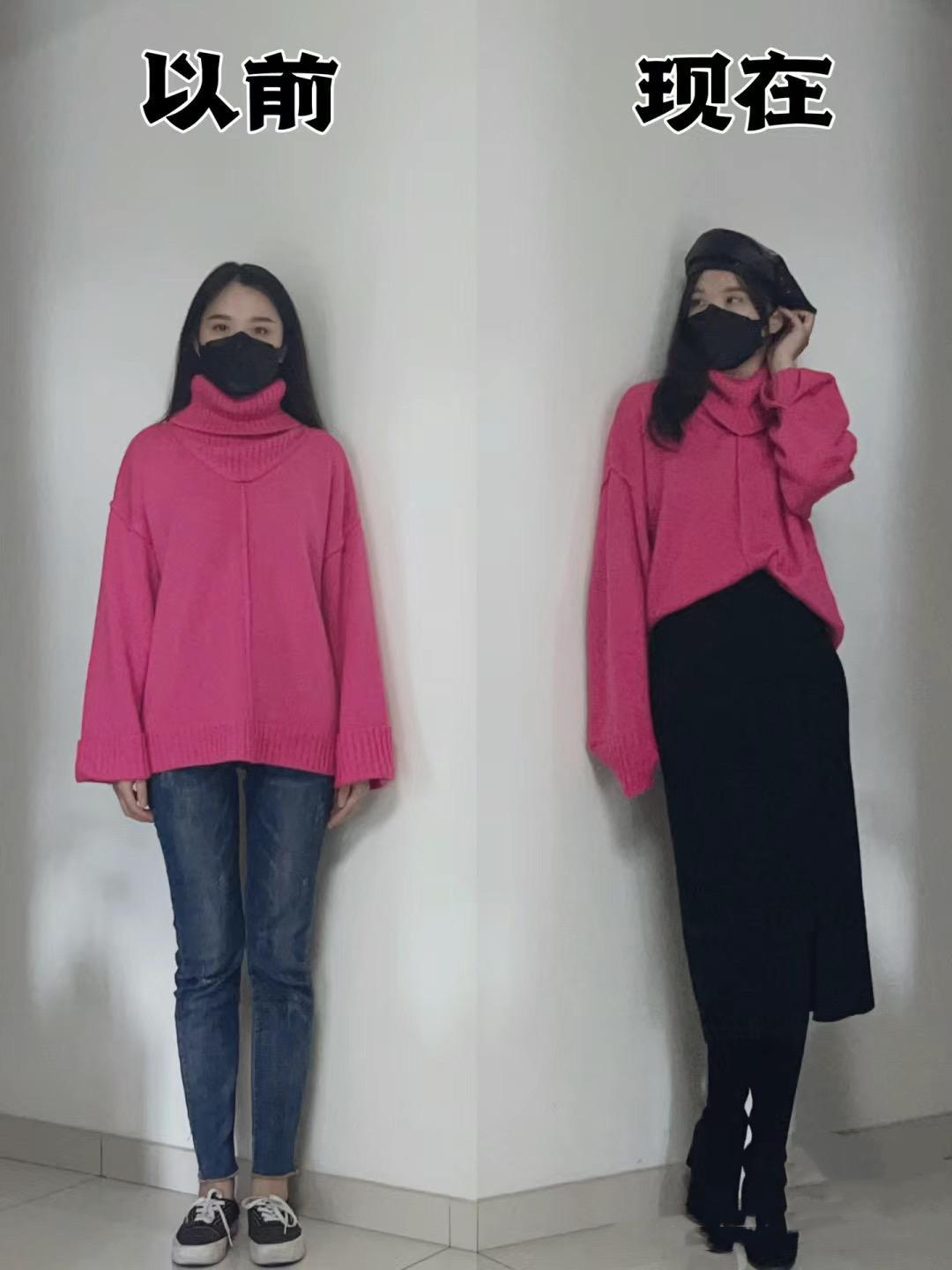 同一件紅色高領毛衣,在搭配之前配修身的小腳褲來穿着,這種上松下緊的搭配,特別容易顯得上半身厚重,不適合蘋果型身材。