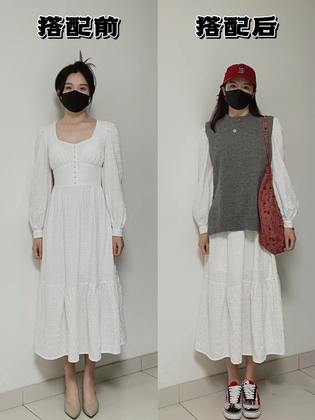 搭配後,可以選擇春季非常實用的疊穿。用白色連衣裙配灰色針織馬甲,層次更強也更文藝耐看,搭配了撞色帆布鞋、鴨舌帽,讓白色連衣裙的穿搭透着少女的文藝範。