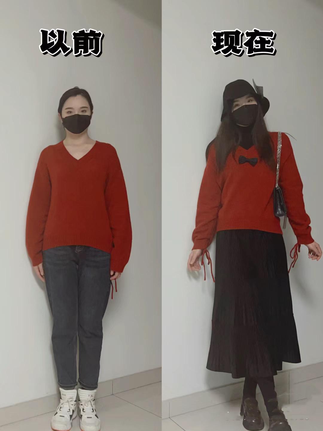 比如這種紅色的V領針織衫,搭配前平淡無味、缺少了時尚氛圍。搭配後則更加精緻洋氣,還是那件紅色V領針織衫,疊搭黑色連衣裙、配黑色蝴蝶領結、漁夫帽,洋氣還顯臉小。