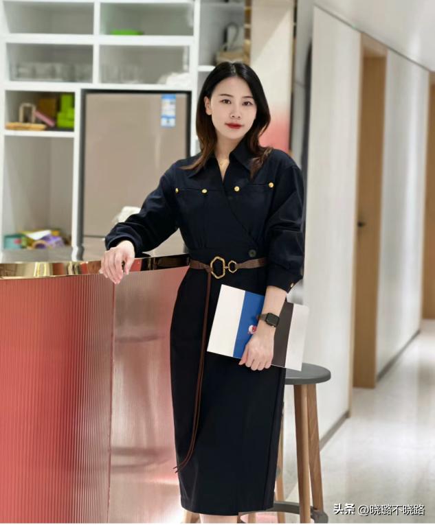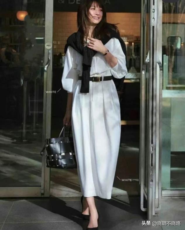 需要注意點,並不是所有的裙子加了腰帶之後都能夠瞬間延長比例,關鍵還要看裙襬的具體走向。大家儘量選擇這種稍微合身的窄長款式,避免裙襬向兩側炸開,這樣能夠更好地延伸裙長,顯得更加修身洋氣一些。同時,大家也可以藉助有垂直感的面料,進一步加深它的縱向線條。