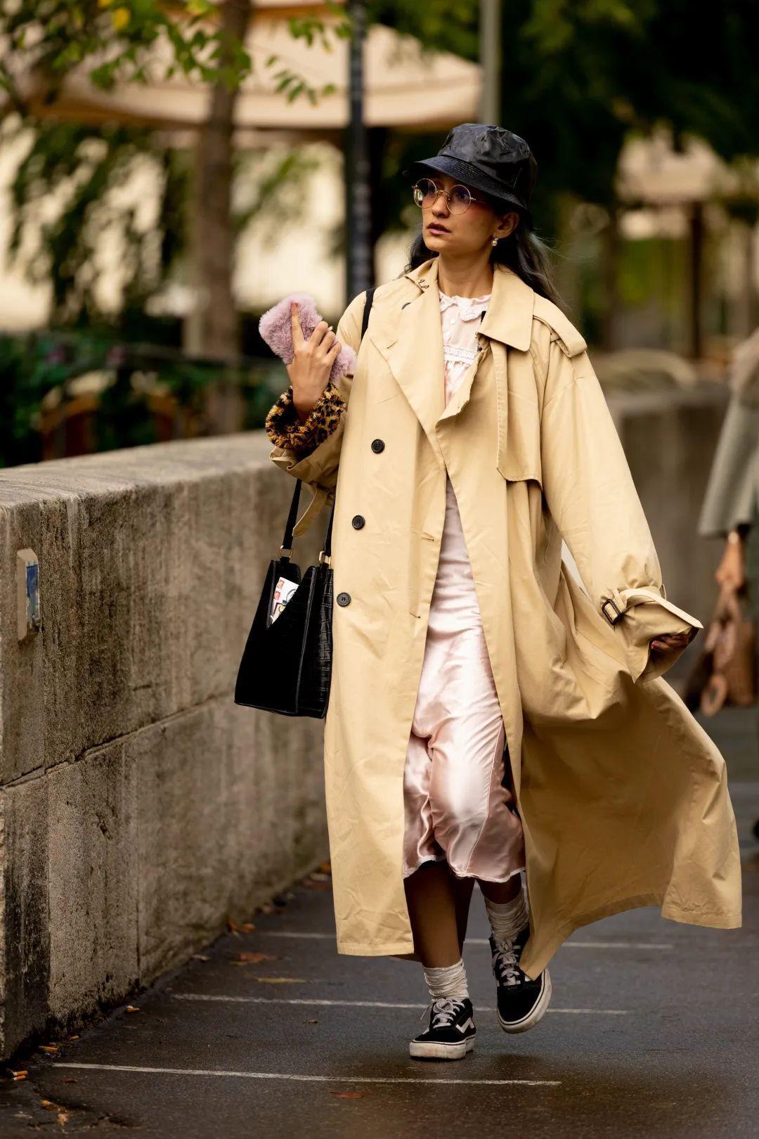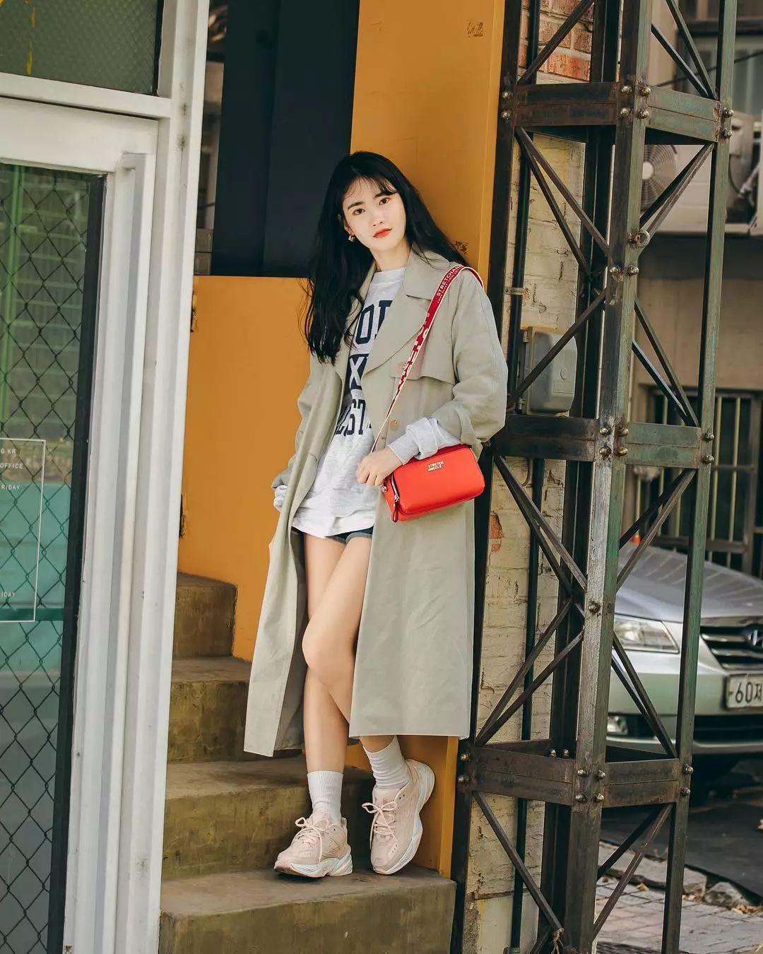 小個子女生若選擇了長款大一號風衣,下裝最好玩“失蹤”的穿法,露出腿部肌膚來,就很好在視覺上拉長腿部線條,也能打造出高挑感。