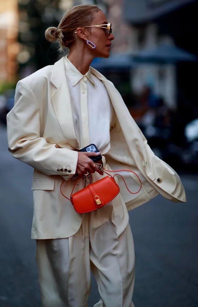 當你選擇同色系的穿搭時,可以適當加入一些小面積配飾進行點綴,如一個亮色包包,不要小瞧這麼一個包包,它能讓你的穿搭瞬間變得出彩起來,也提升了時髦度。