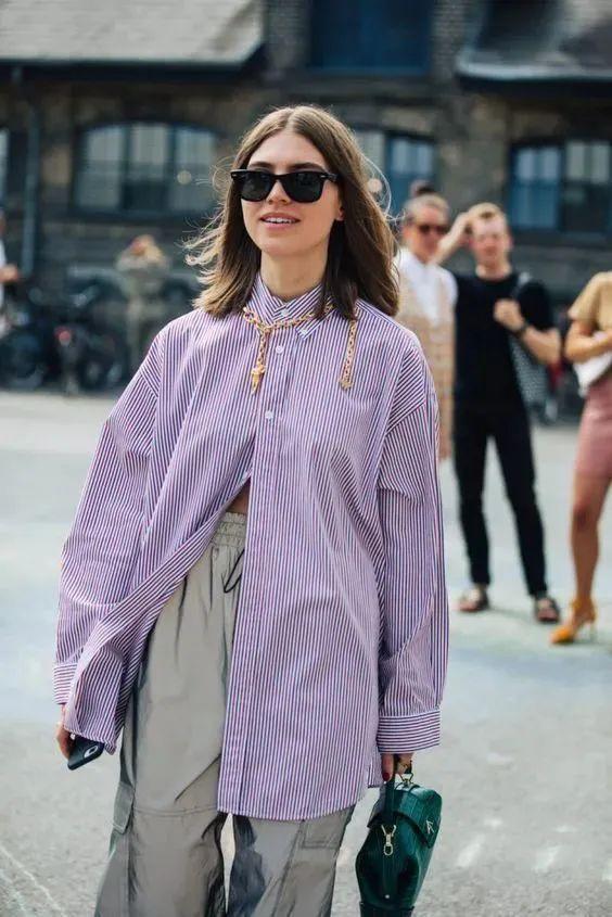 乾淨的白襯衫是簡約大方的,那麼這種融入了條紋元素的襯衫款式,則多了些時尚感。當然,豎條紋的款式,加上大一號版型,讓你穿出更顯瘦的效果。下裝可以搭配牛仔褲,或者是工裝褲,英姿颯爽的男孩子氣就出現了。