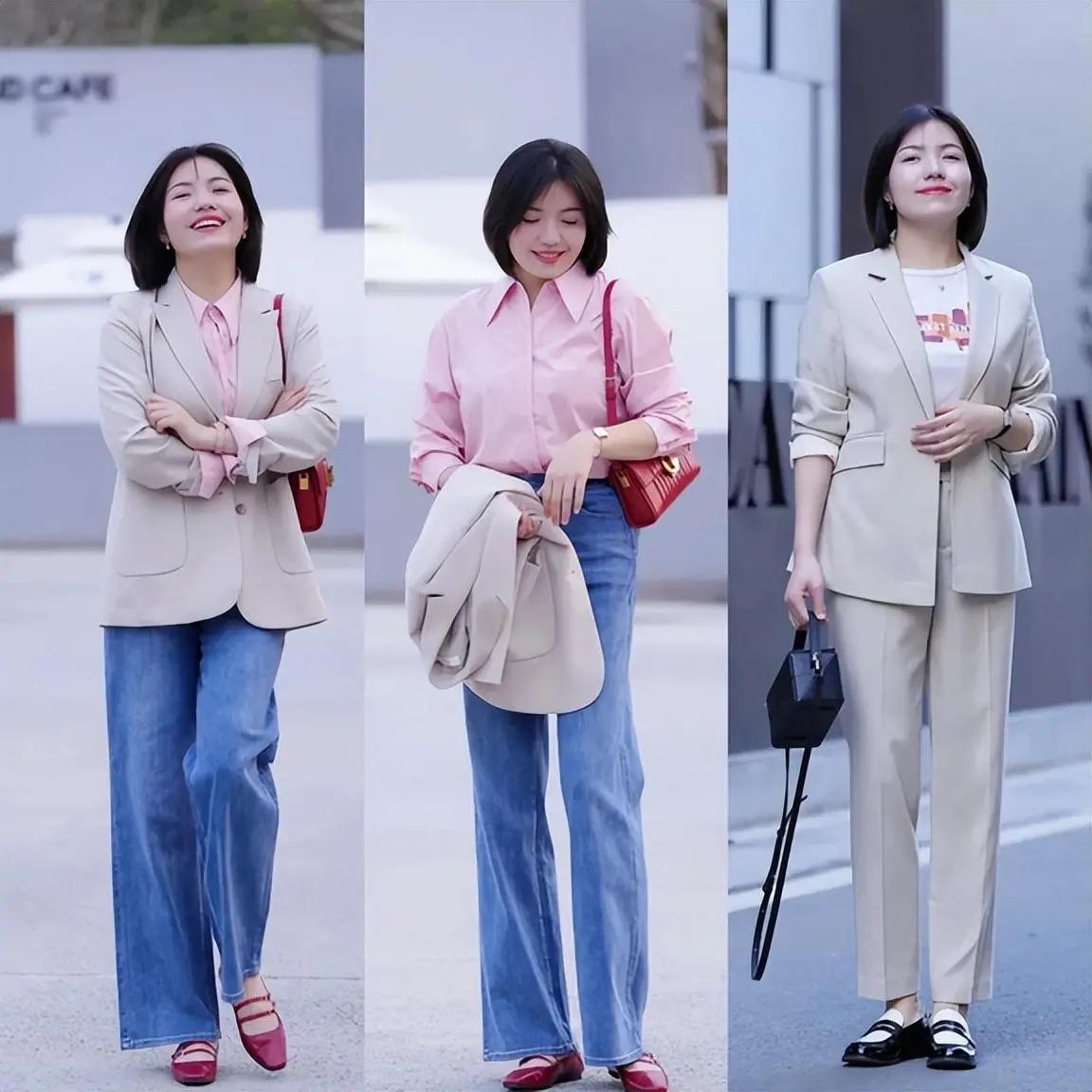 如果是需要通勤上班的話,建議大家選擇這樣一組穿搭look。簡單利落的西服外套,配上粉色系的襯衫,搭一件高腰的直筒牛仔褲,簡單又省心。