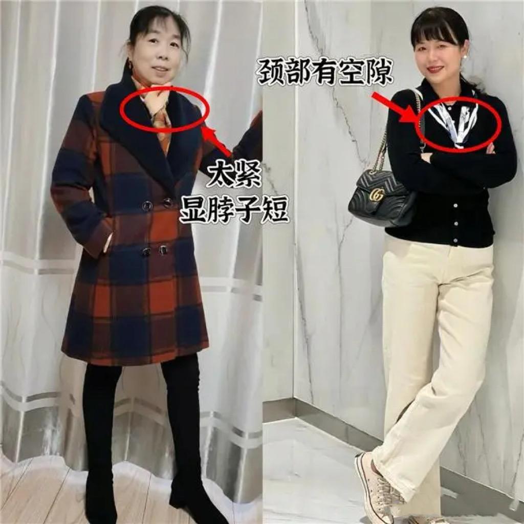 如果絲巾緊緊的勒在脖子上,就會顯得很壓抑,也可能顯得脖子短。我們佩戴絲巾的時候,最好與頸部線條流出少許的空隙,可以塑造出輕盈時尚感。
