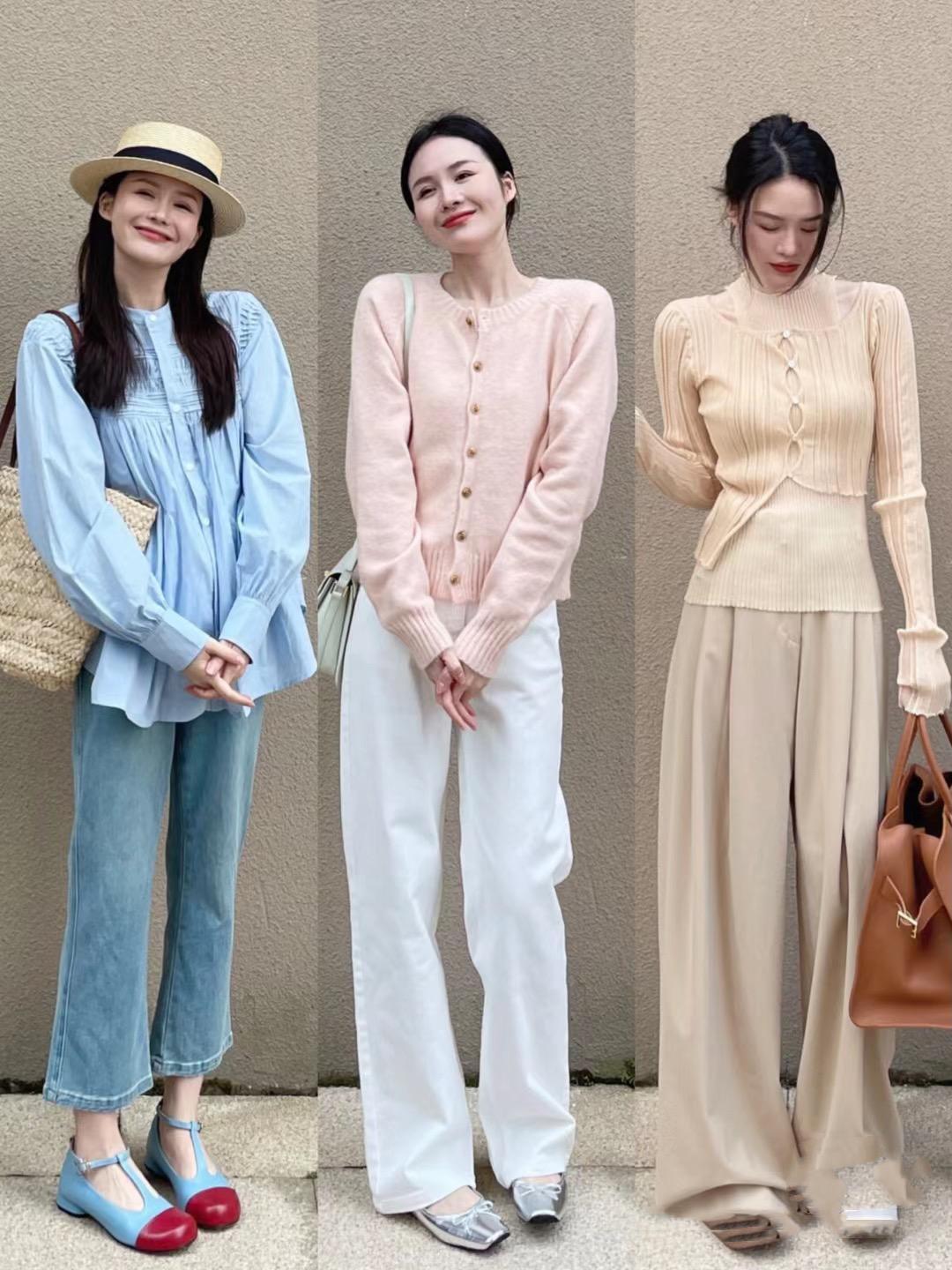 可以是套頭的針織衫、也可以是開衫的針織衫。不管哪一種款式,都可以儘量選擇細線針織的面料,穿起來軟糯溫柔。春衫自帶女性的柔美、也符合中年女性的氣質。
