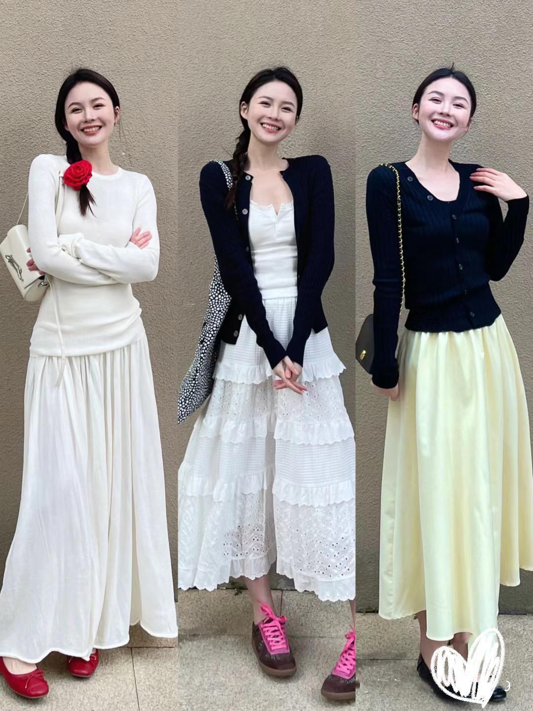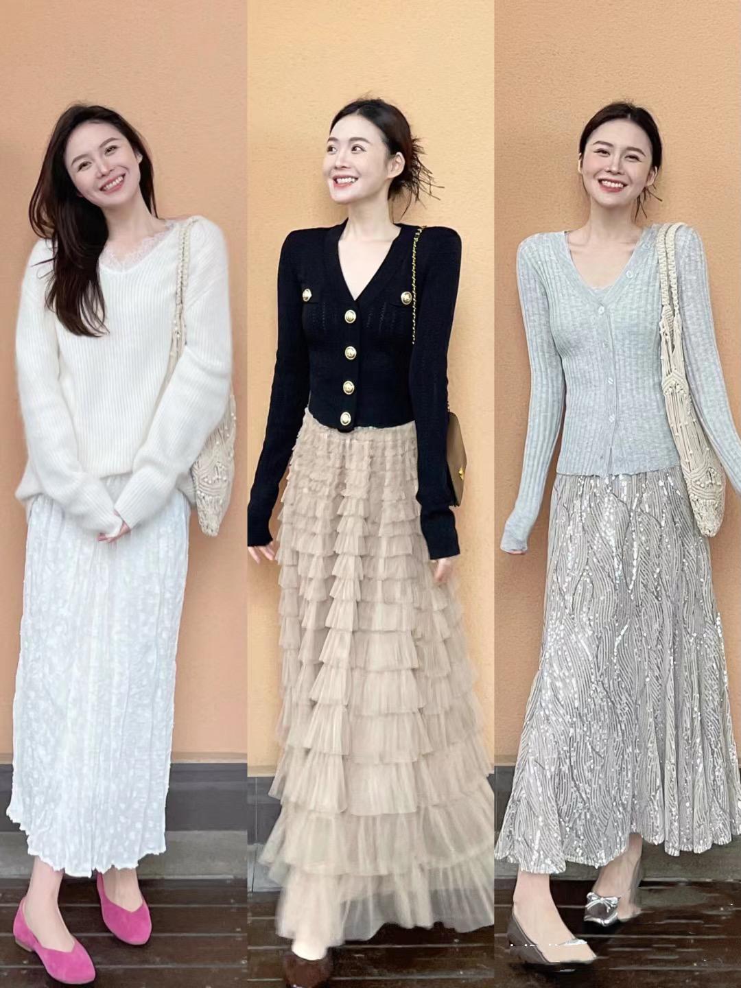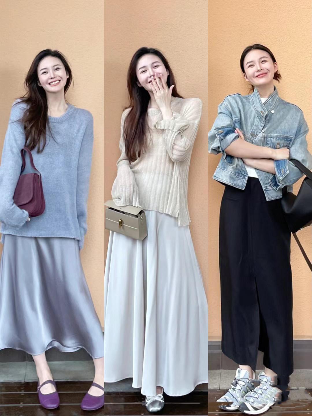 寬鬆針織衫配半身裙,更多了幾分慵懶氛圍。修身針織衫配半身裙,可以勾勒出上半身的纖薄美。寬鬆的半身裙,大量感的設計、包容性更強,穿起來也是溫柔浪漫的。