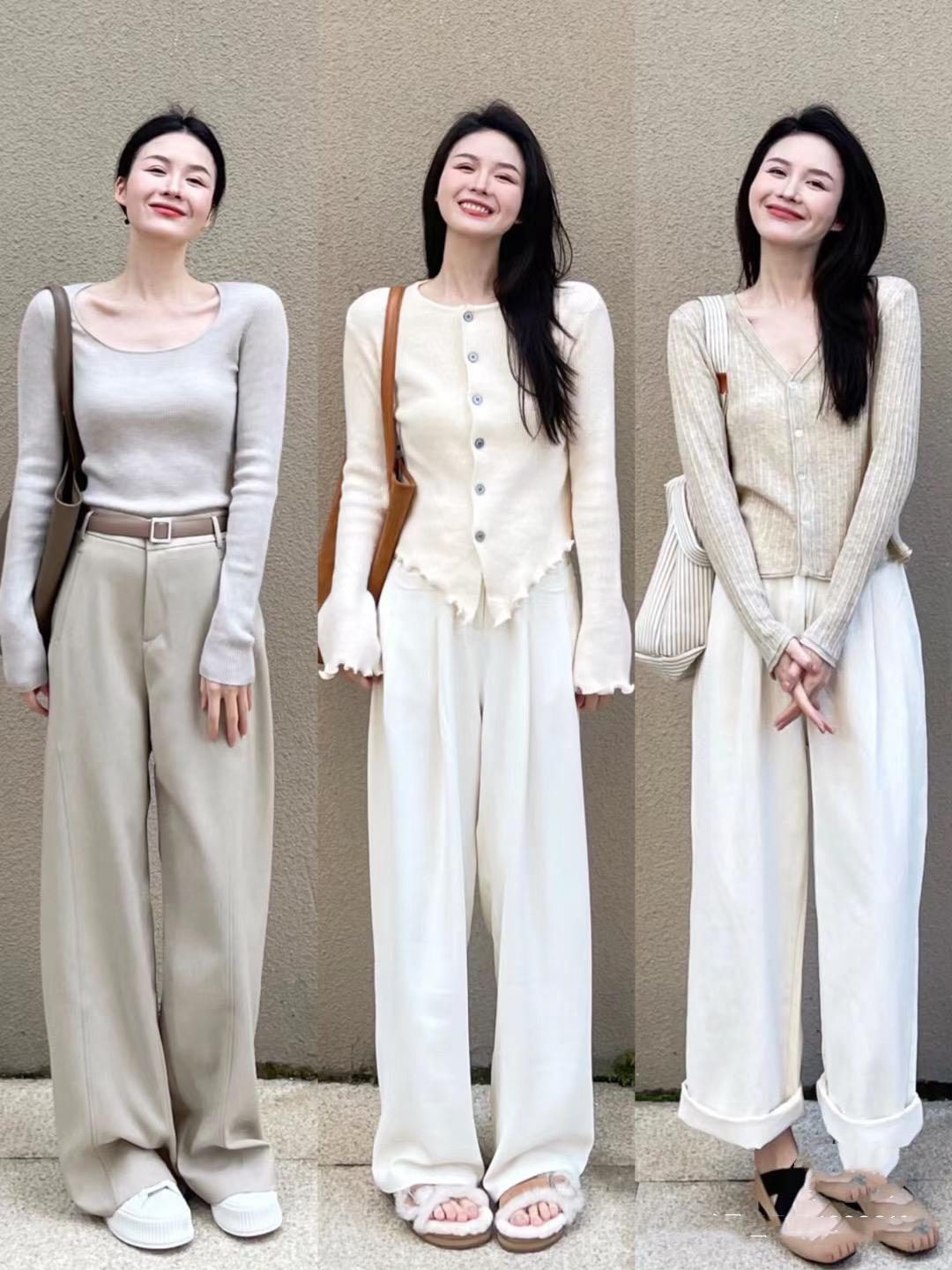 針織衫搭配白色直筒褲,有一種清爽乾淨的美。白色直筒褲面料稍微挺闊一些,寬鬆且筆挺的版型,具備了更強的修飾性,可以顯得身材挺拔。