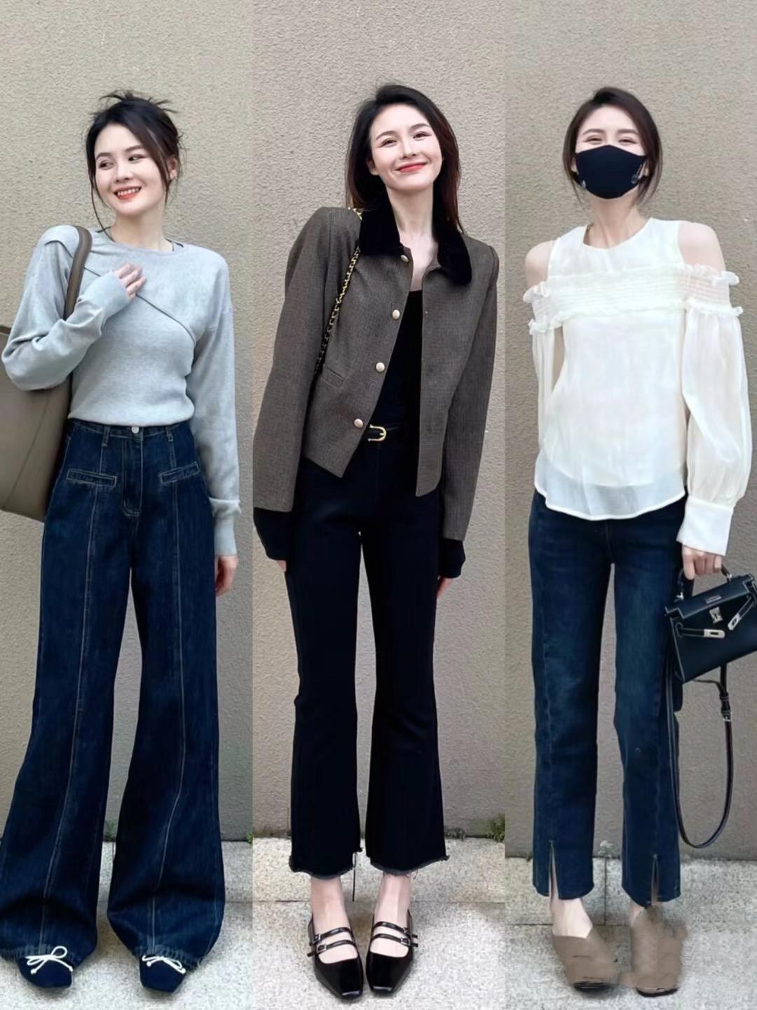 相對於裙裝的浪漫唯美,褲裝的搭配一定是利落大方的。高腰的直筒褲,我們可以選擇九分褲或者基地褲的款式,都可以在一定程度上修飾腿型。