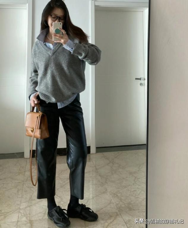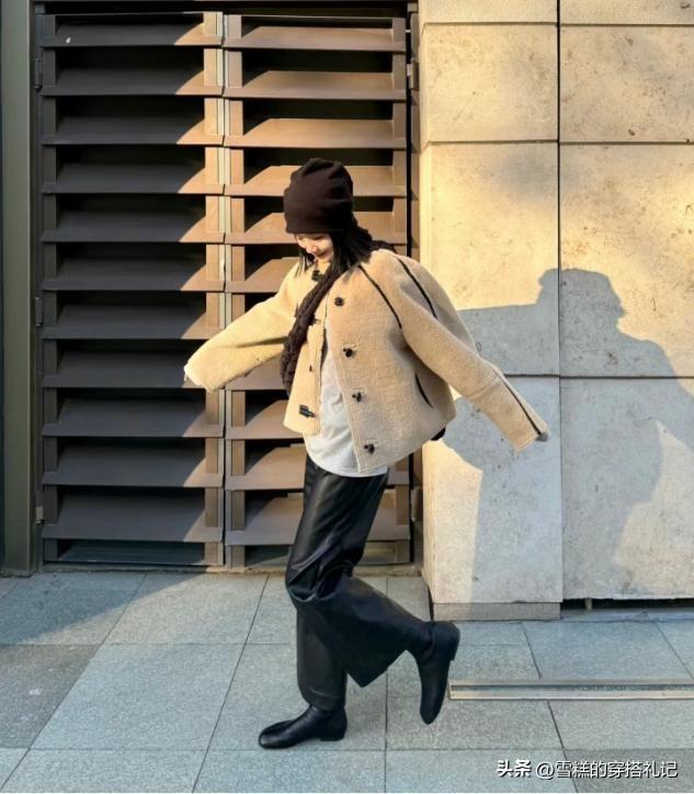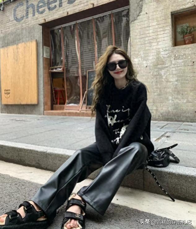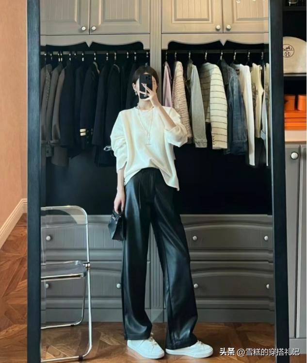 細心的女生肯定已經注意到了,我們推薦的皮褲並不是傳統的緊身皮褲,雖然保留了面料的光澤感,但是預留了闊腿褲的輪廓,所以大空間的穿着讓皮褲的遮肉效果也會更好,整體的顯瘦效果也不差。