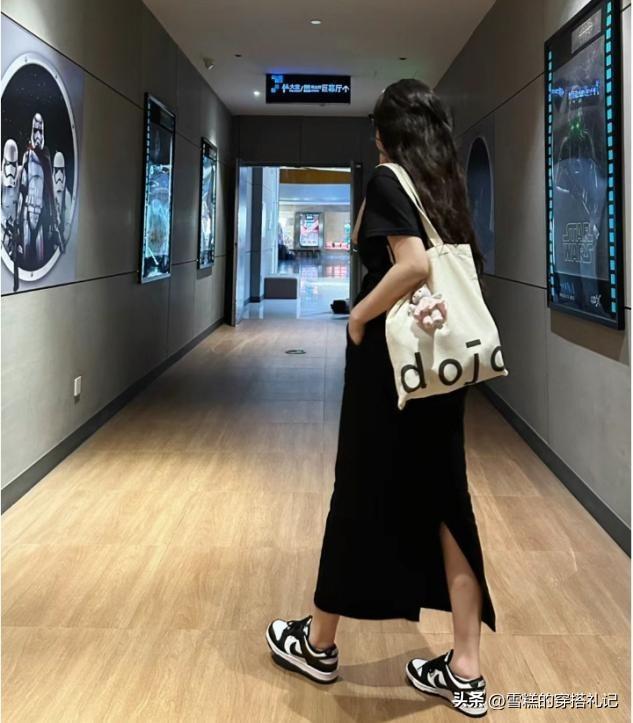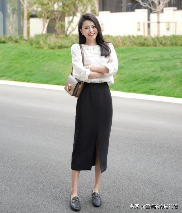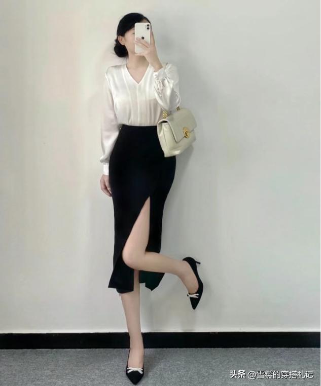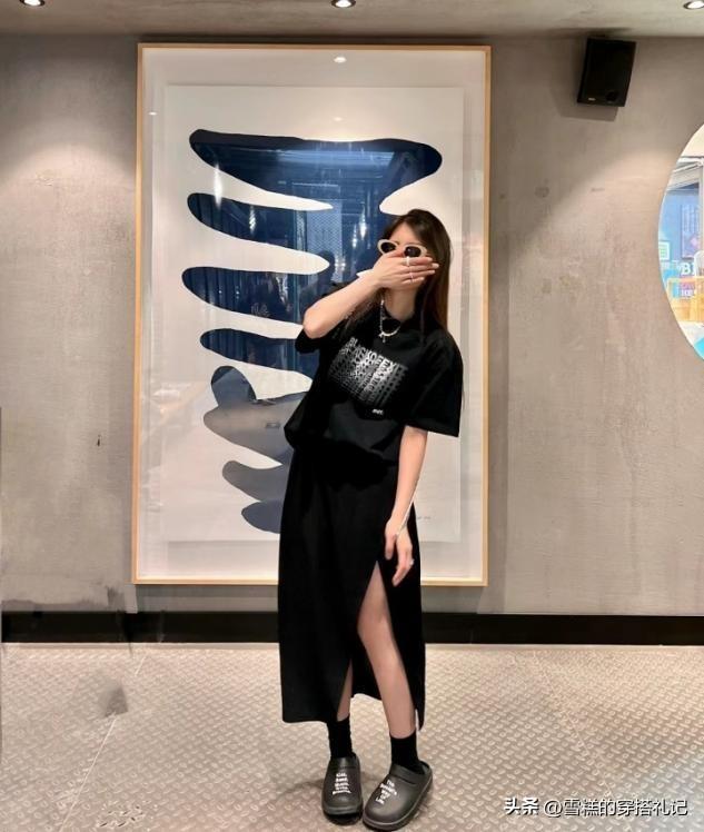 上衣的款式選擇和半身設計的開叉裙,也有的組合同色系的穿法,可以參考圖中這一套全黑的造型,深色系包容身材,可以拉長身形曲線,一種顏色的順暢流利展示,可以詮釋出你的時尚能力,不會本末倒置。