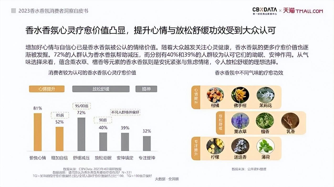 隨着年輕一代消費者個性化以及悅己需求的升級,怡人香氣所能帶給消費者的極致情緒及情感體驗帶動了香氛使用場景的細分多元。香氛修復的不是皮膚,而是人的心靈。《2023年香水香氛消費者洞察白皮書》顯示,72%的人羣認爲香水香氛幫助減壓,而分別有40%和39%的人羣認可它們的助眠、安神作用。可以看出,香水香氛的心靈療愈價值凸顯,提升心情與放鬆舒緩功效受到大衆認可。特別是洗護、織物護理等系列產品,是否擁有獨特香氣成爲產品能否吸引消費者一大關鍵因素。