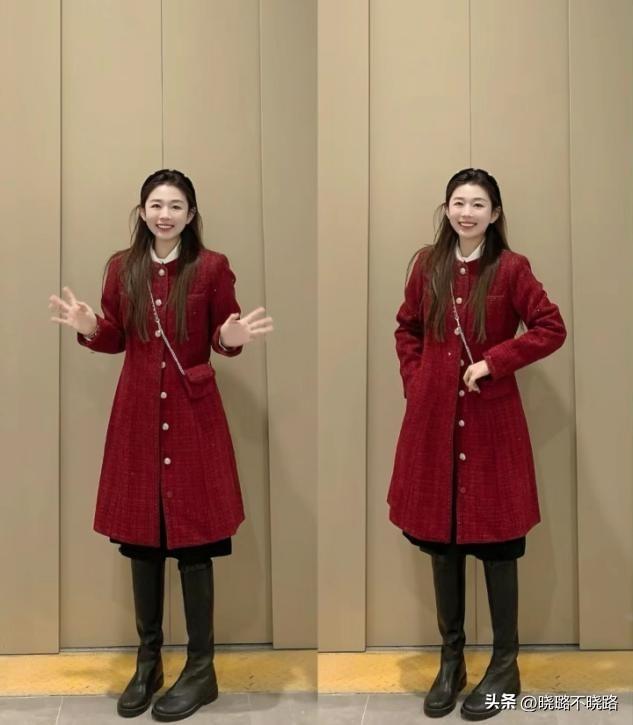 成熟的中年女性駕馭小香風外套,色的飽和度可以偏高一點,棗紅色是一種特別凸顯氣色的顏色,上半身更顯膚色特點,黑色的裙裝維護線條的修身感,不容易顯胖。
