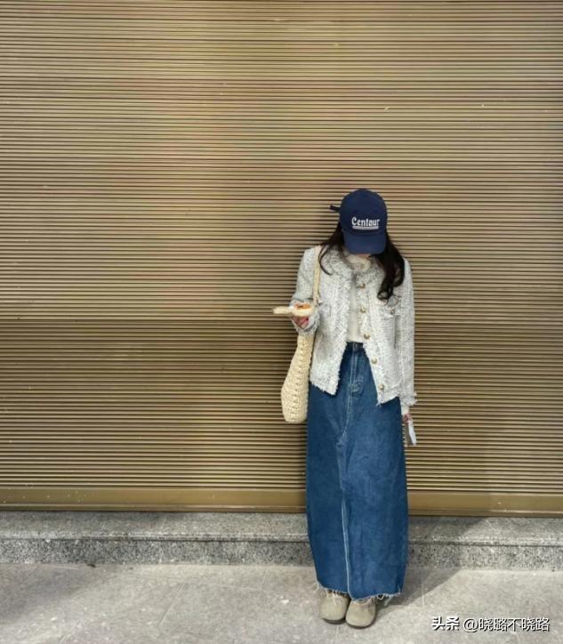 藍色和白色的配色組合,參考圖中這一套牛仔裙和小香風外套的搭配,白色用在細花呢款式的小香風上,利用紐扣或者是鏈條做好視覺的點綴,牛仔面料的齊踝裙設計休閒感,利落的曲線,用作通勤造型也很不錯。