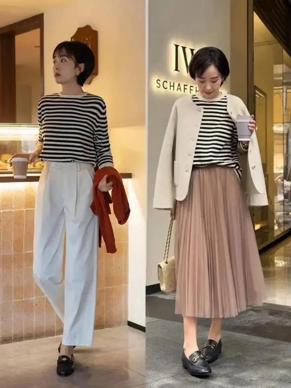 清爽耐看的條紋打底衫,也是不變的經典潮流。黑白條紋、經緯分明的設計,格外的高級大方。日常的穿搭中,黑白配色也高級耐看。