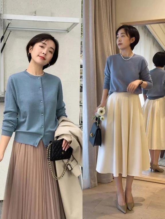 像這種淺藍色的針織開衫,我們可以搭配一種收腰的設計,穿起來更加利落。用淺藍色針織開衫配上輕柔的百褶半身裙,溫柔嫺靜、格外的減齡。