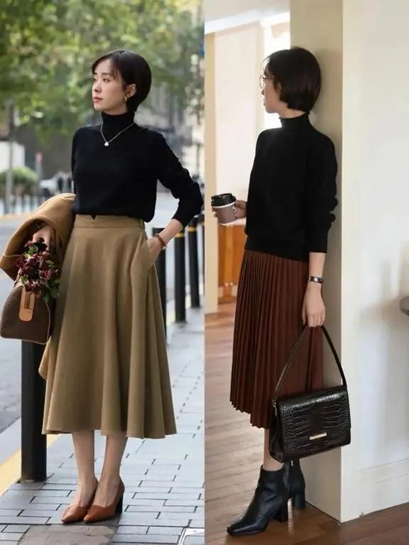 我們可以用基礎款的黑色針織衫,來搭配高腰的半身裙。不管是高腰的百褶半身裙、還是波浪半身裙,都是一種大量感的設計,可以包容腰臀部的厚重感。