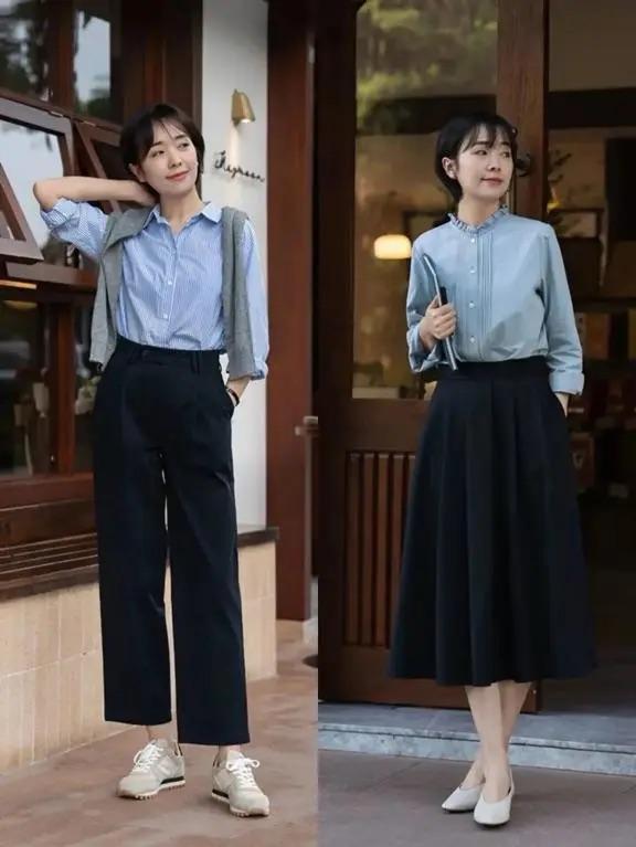 淺藍色襯衫可以配黑色的高腰半身裙/直筒褲,藍黑配色也非常的經典、耐看。淺藍色襯衫靠近臉部線條,可以在一定程度上顯白、提氣色,配黑色半身裙,高級顯氣質。