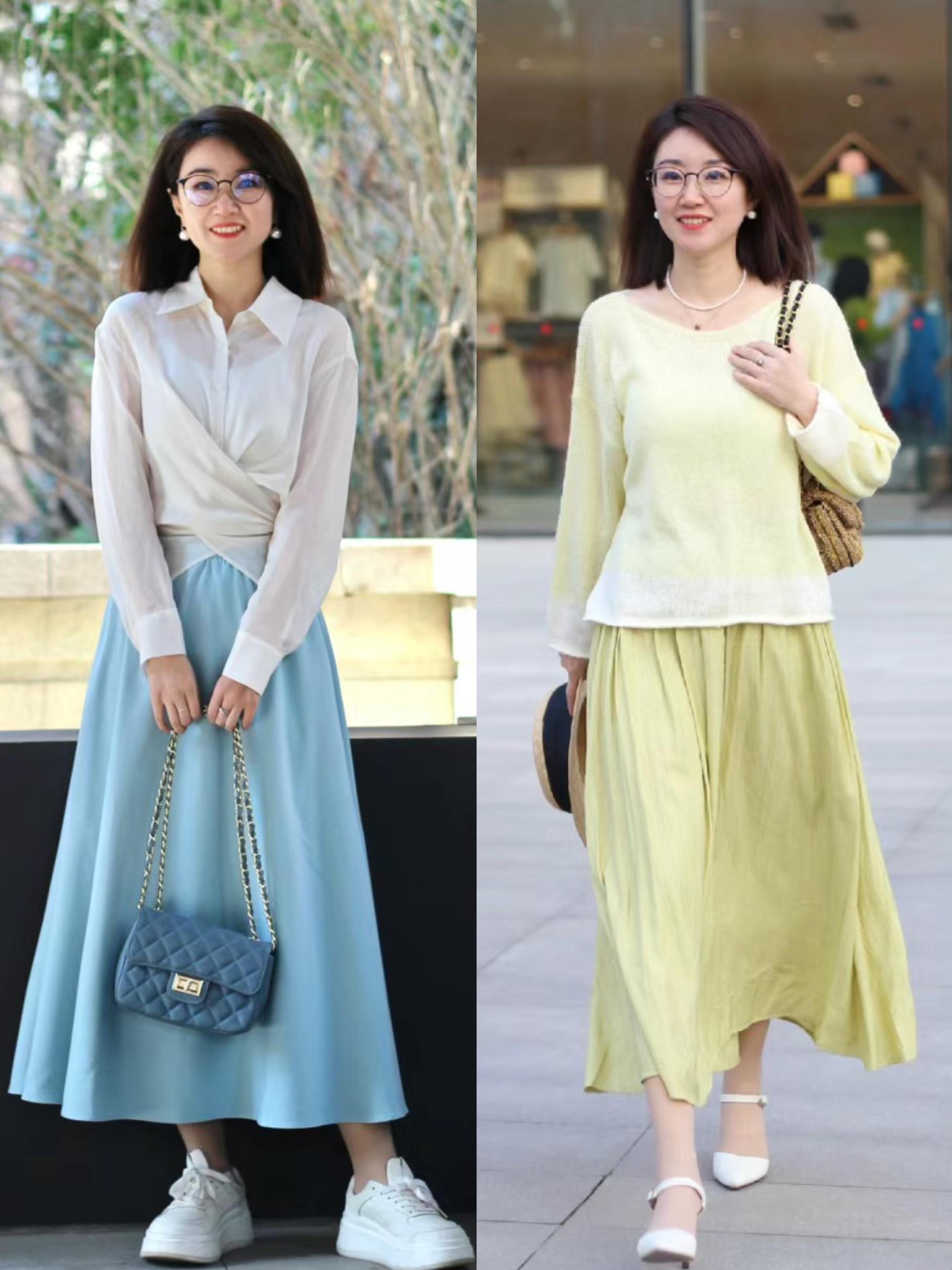 知性優雅的女神範穿搭,總是有一種溫柔嫺靜的美,服裝的配色也可以更加溫柔一些。比如白襯衫配藍色半身裙,就乾淨澄澈、適合通勤上班。