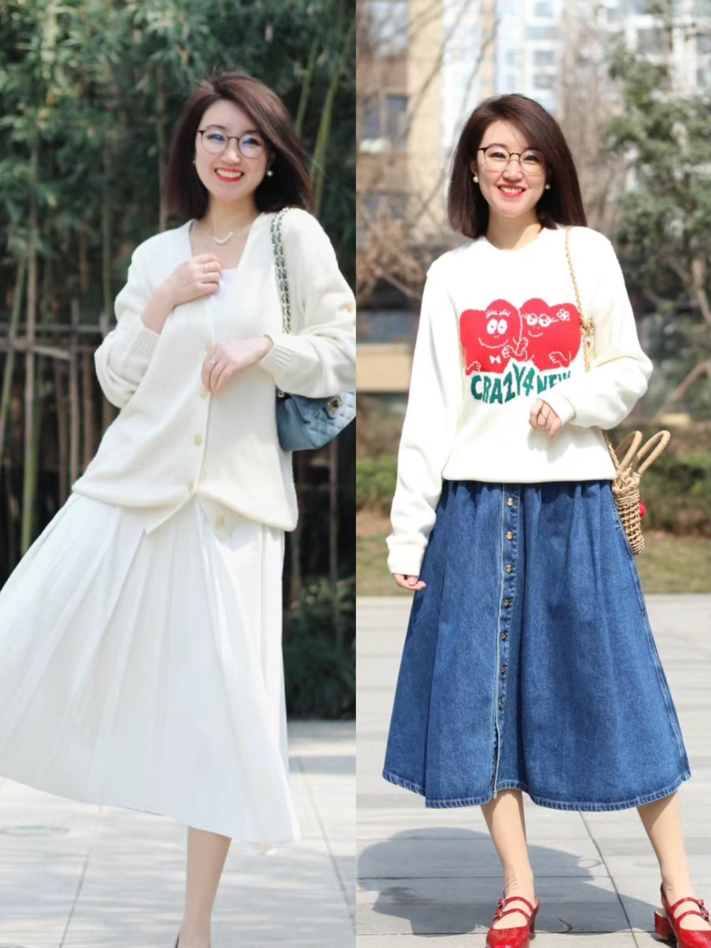 穿衣搭配上,可以選擇清新雅緻的色系。比如白色的針織衫、衛衣,都是自帶減齡感的單品。我們可以配同色系半身裙、也可以搭配牛仔半身裙,都是甜美減齡的,可以模糊年齡感。