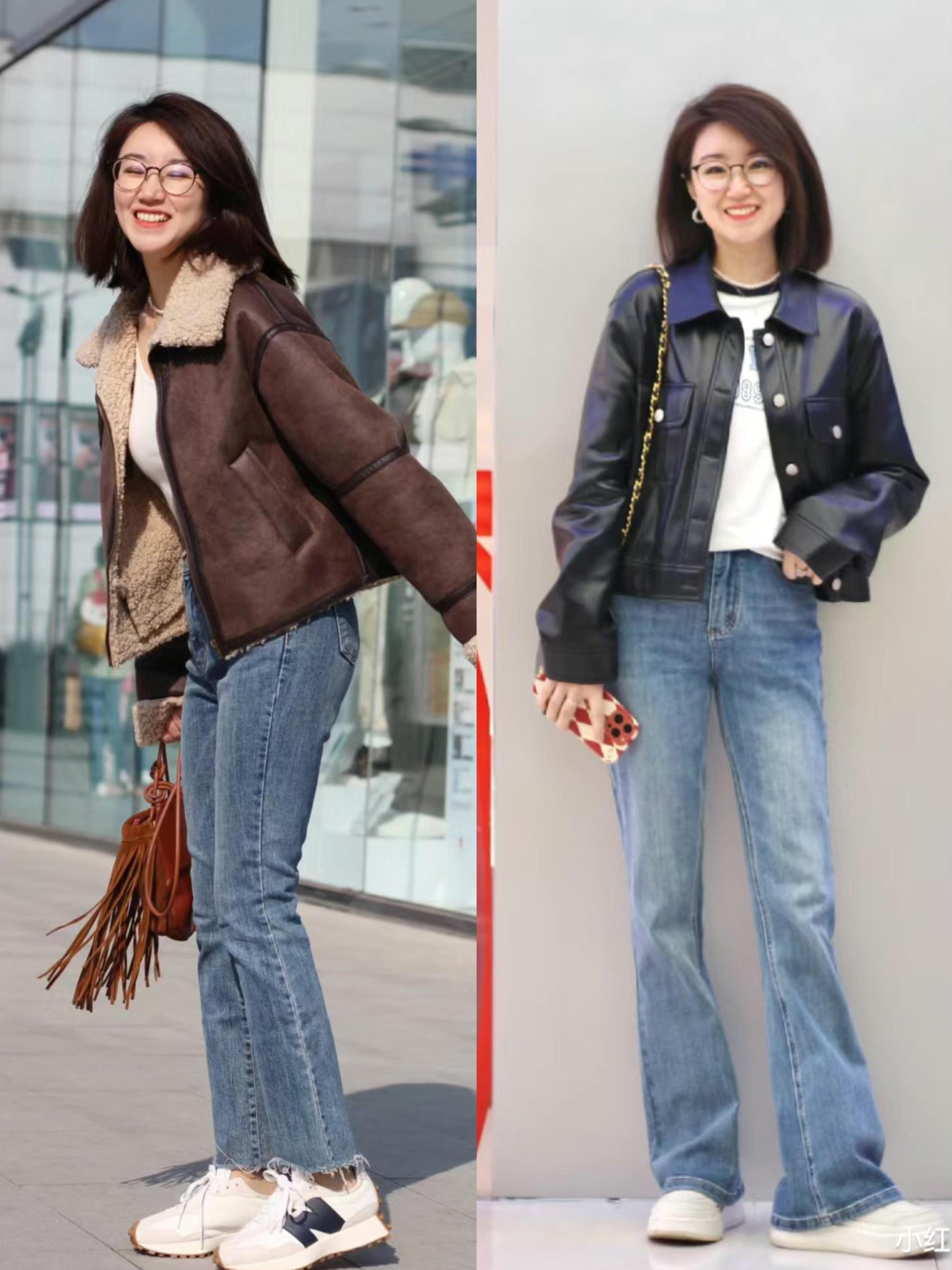 尤其是高腰的直筒牛仔褲,對於小個子非常友好。我們可以用高腰的直筒牛仔褲來搭配短款的皮衣外套,呈現出又酷又美的風格,簡單且時尚。