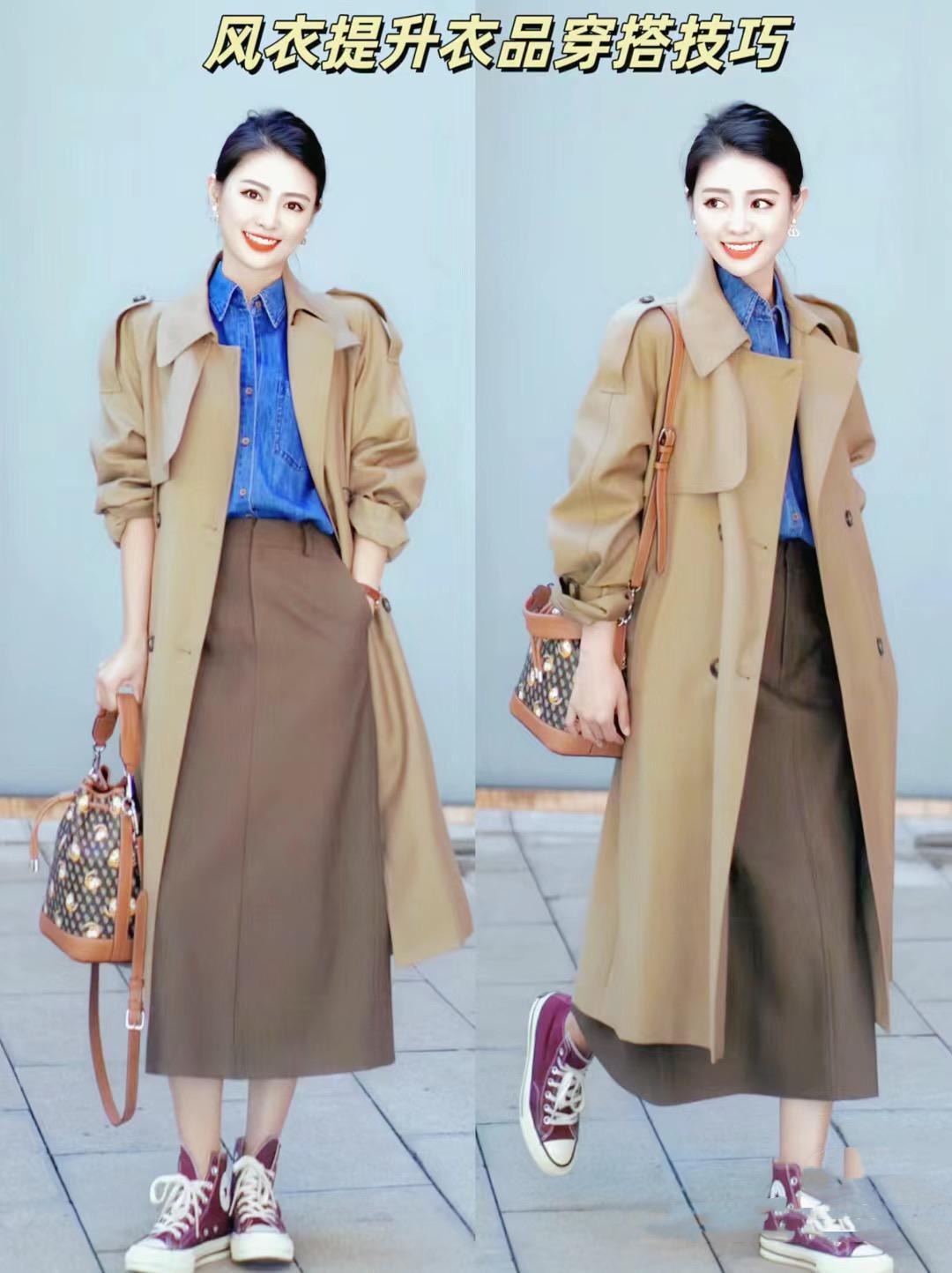 如果內搭的色彩,並沒有保持一致。我們我們可以選擇內搭的色彩,與風衣的顏色一致。就像牛仔襯衫+半身裙的組合,便選擇了半身裙與風衣色彩一致的搭配。