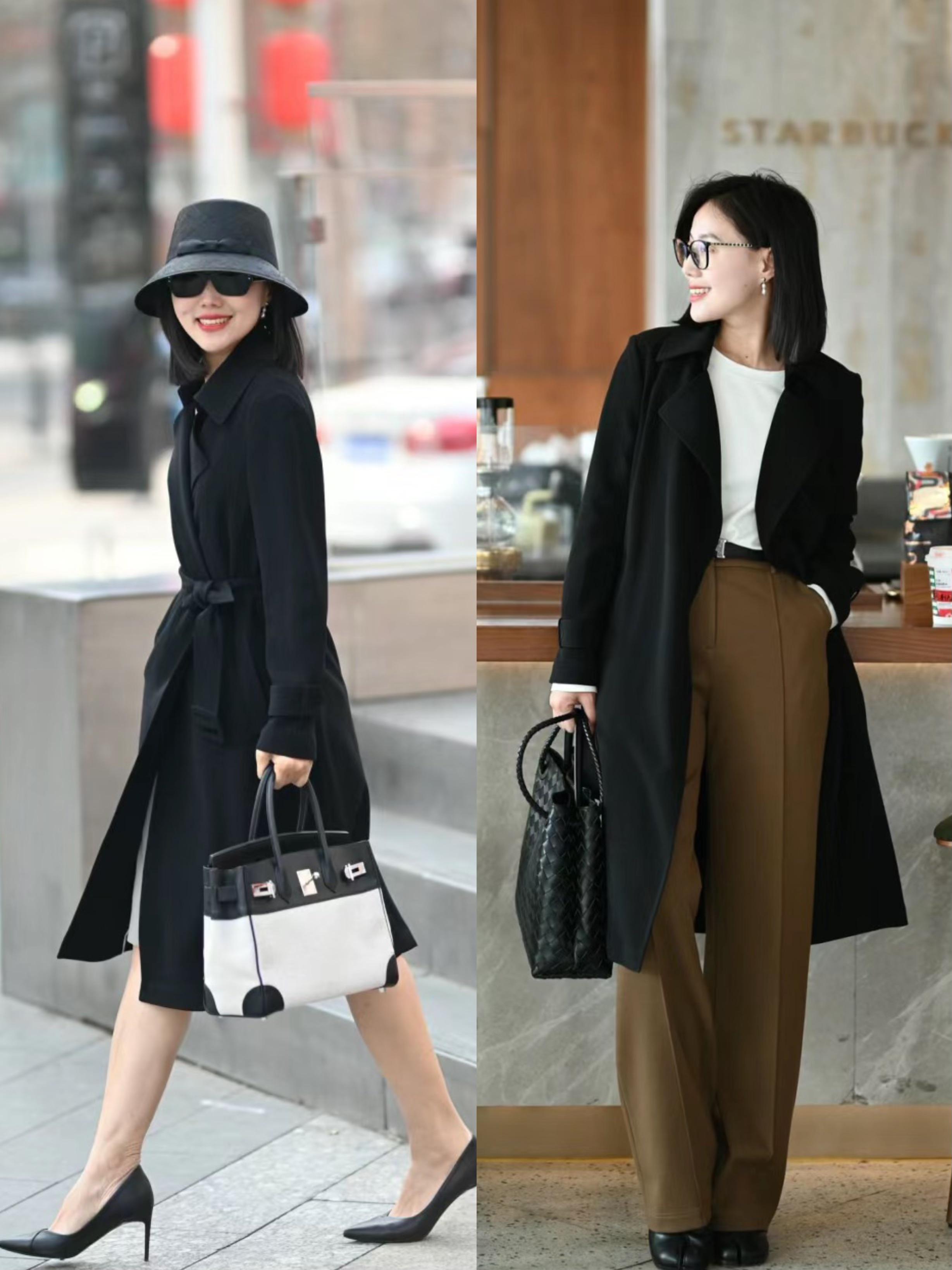 西裝褲作爲職場必備單品,對於身材的修飾性更強,也是一種偏向中性風格的單品。像這種利落的西裝褲,我們配寬鬆的風衣外套,簡約大方、帶着高級美。