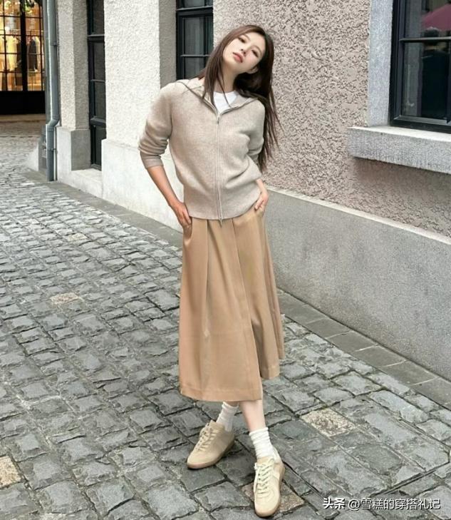 比較慵懶的穿法更需要大輪廓上衣,比如衛衣或者開衫外套匹配長筒襪,更適合去設計下衣失蹤的穿法,一雙尖嘴綁帶的德訓鞋,維護了雙腿的曲線長度。