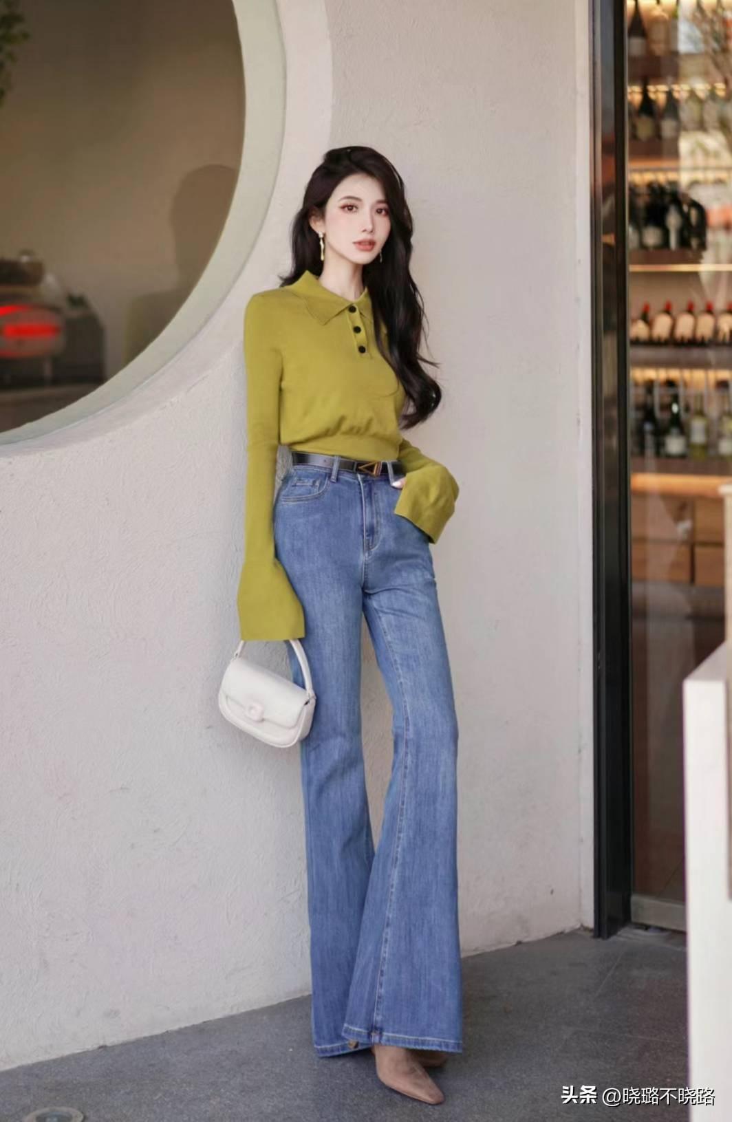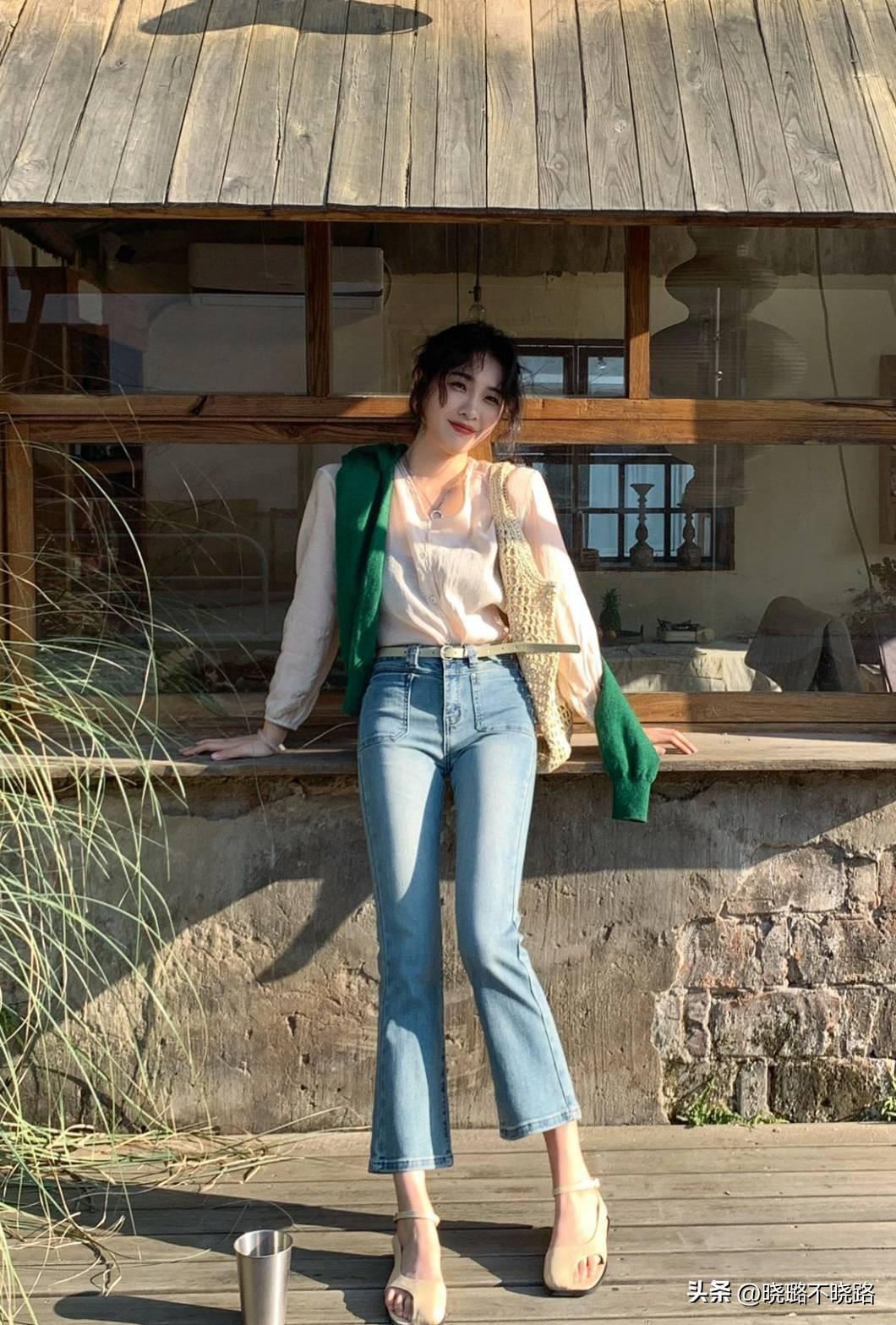 上窄下寬的微喇褲,爲很多女性解決了腿型上的煩惱,也正是因爲有這種寬窄對比的效果,所以纔可以襯托的大腿更加纖細。