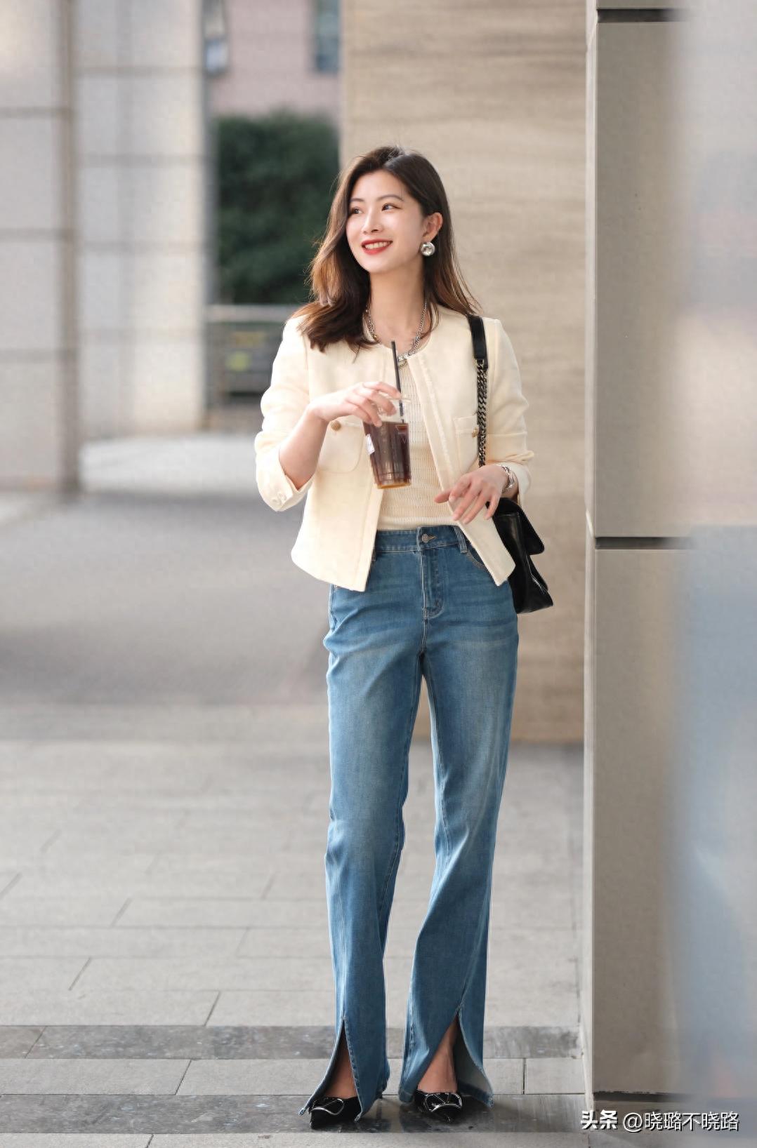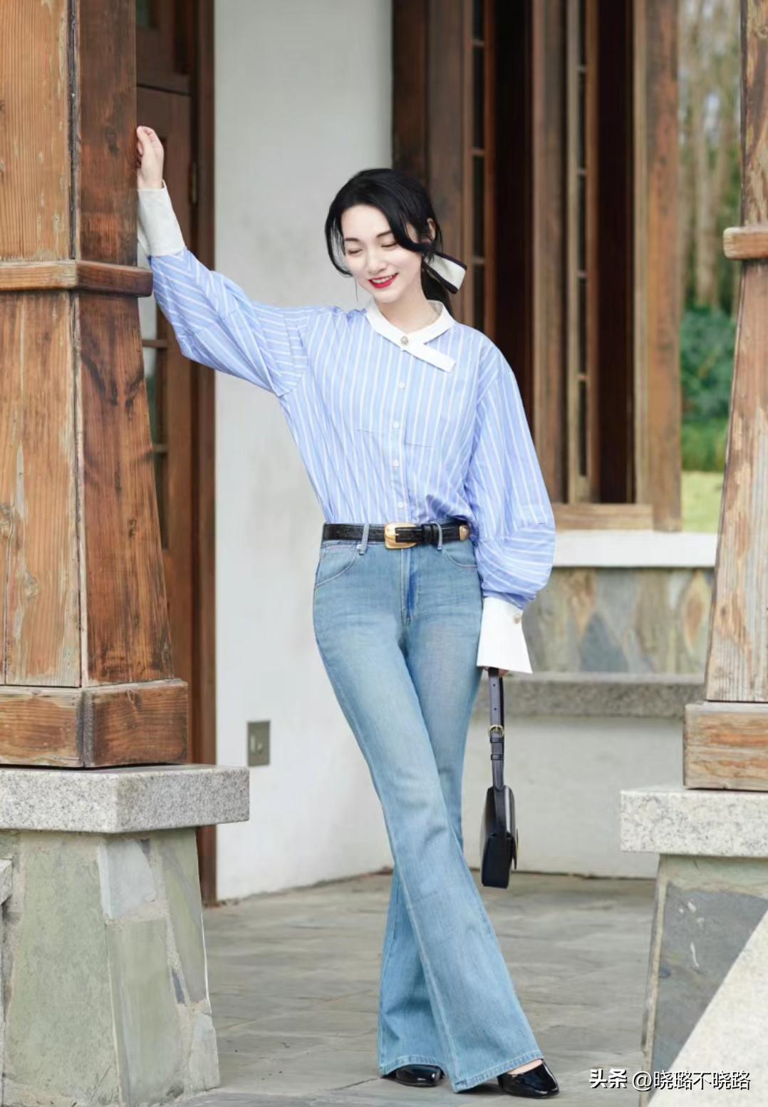 牛仔藍給人的感覺就十分乾淨簡約,而且獨有的硬挺感,在視覺上可以很好的達到一個顯瘦的效果,用於微喇褲、直筒褲或者煙管褲當中,輕輕鬆鬆修飾腿型上的不足。