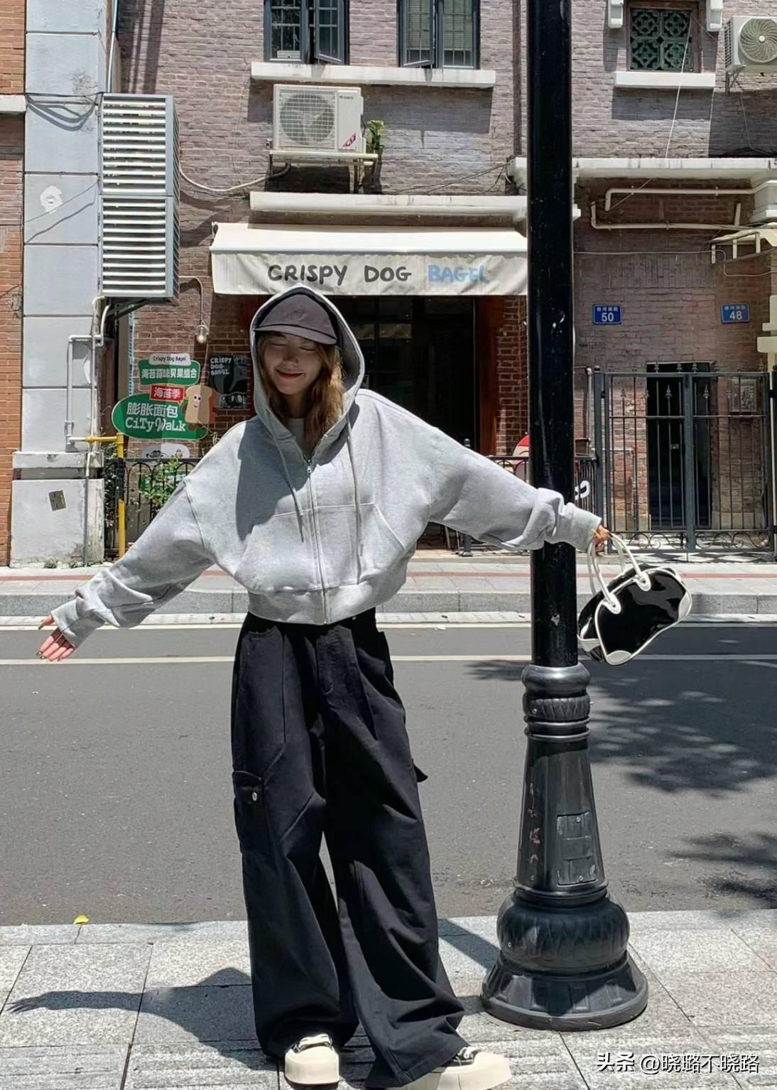 上衣可以選擇長度不過胯部的短款連帽衛衣,在視覺上能夠壓縮上半身比例,再搭配上一條高腰款式的闊腿工裝褲,分分鐘拉長下半身線條。