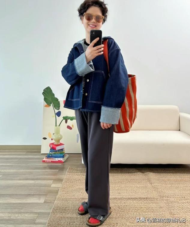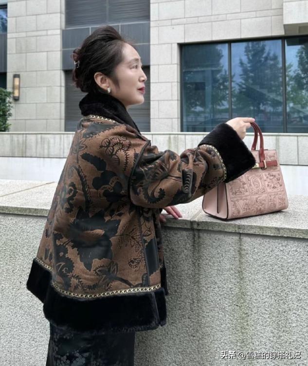 年紀偏大的女人很容易在服裝花樣上面喫虧,比如這種花紋特別明顯的中式上衣外套。偏短款的外套本來就不夠修飾體型,如果再加上花紋的話,整體的視覺就很滿,過於累贅的線條,就很容易放大你的身材輪廓,顯胖沒跑了。