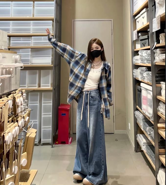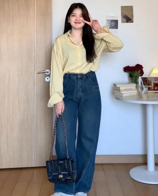 黃色襯衫+深藍牛仔闊腿褲,這一套配色很適合春季呢,襯衫可以作爲防曬衫來穿,裏面加一件小背心之類的,看起來就很不錯。