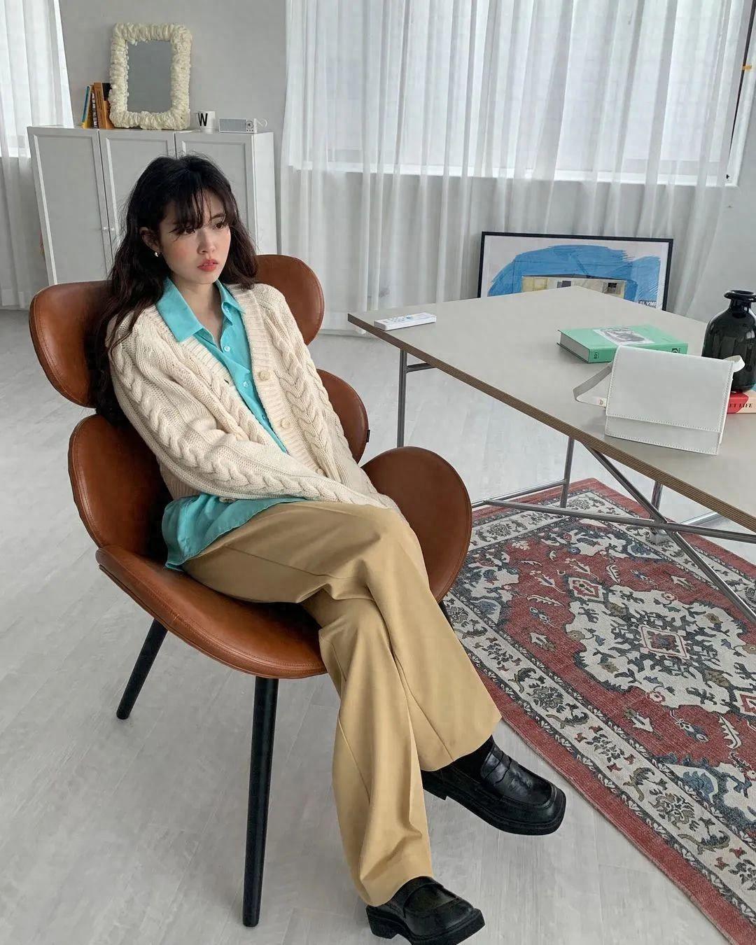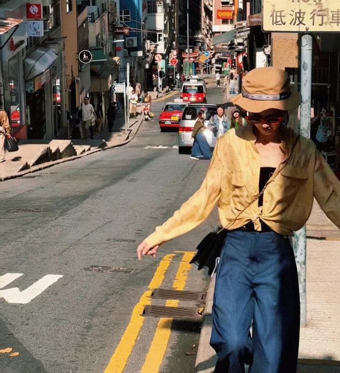 上下衣服的版型都是寬鬆的,藏肉顯瘦效果極佳,一整個還有些隨性的效果。