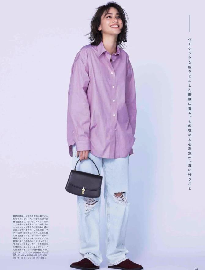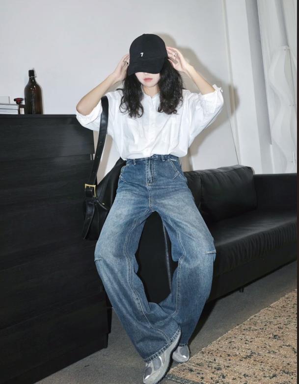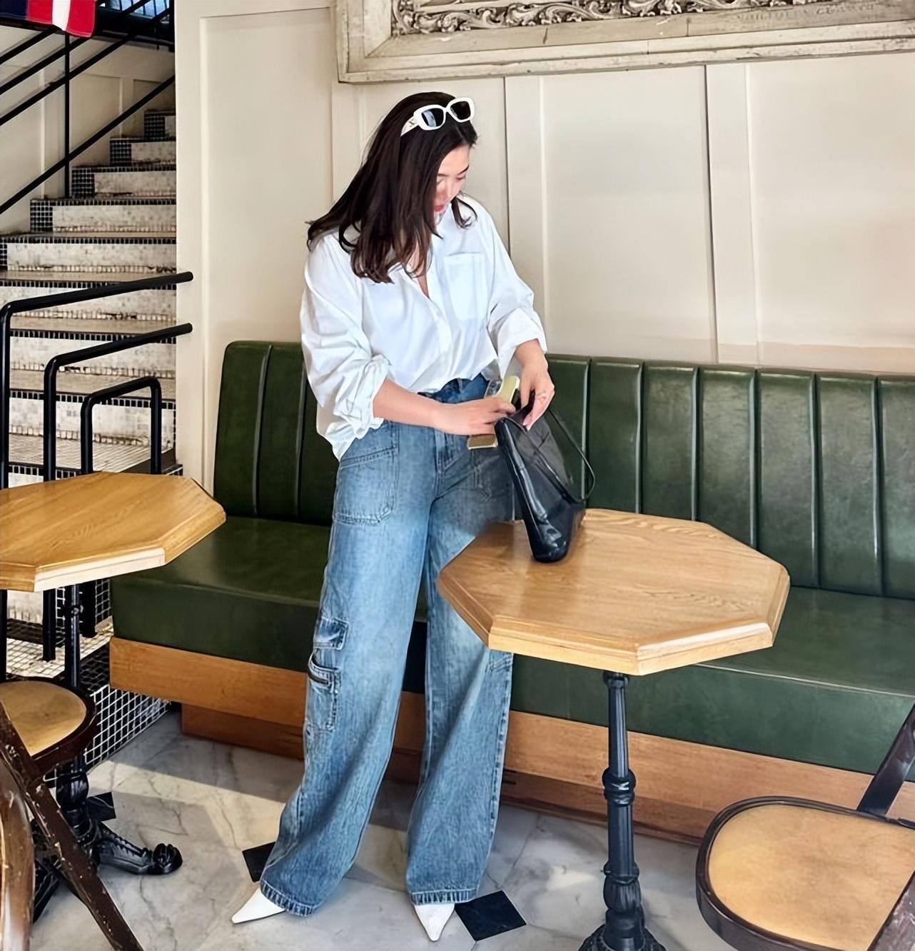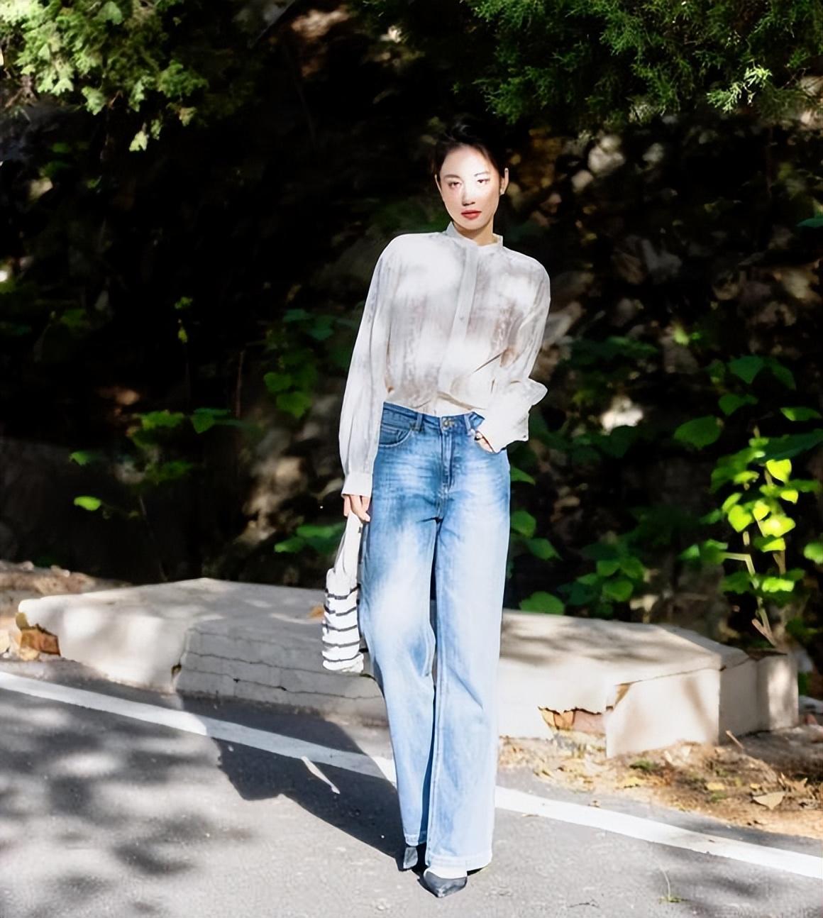 白襯衫和牛仔褲永遠都是絕配,基礎簡約款的白襯衫,就是怎麼都不會出錯的款式,襯衫的版型寬鬆但不會是那種大大的款式,打底單穿效果都不錯。可以與任何下裝相配,像圖片中博主一樣,選擇牛仔闊腿褲,很乾淨利落。