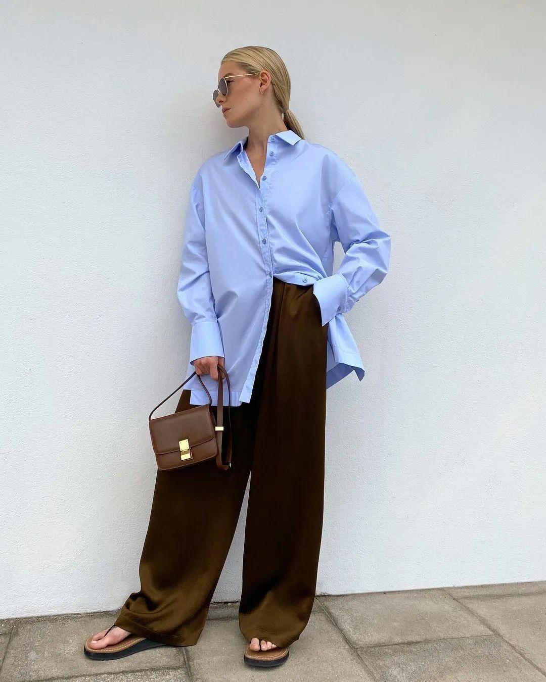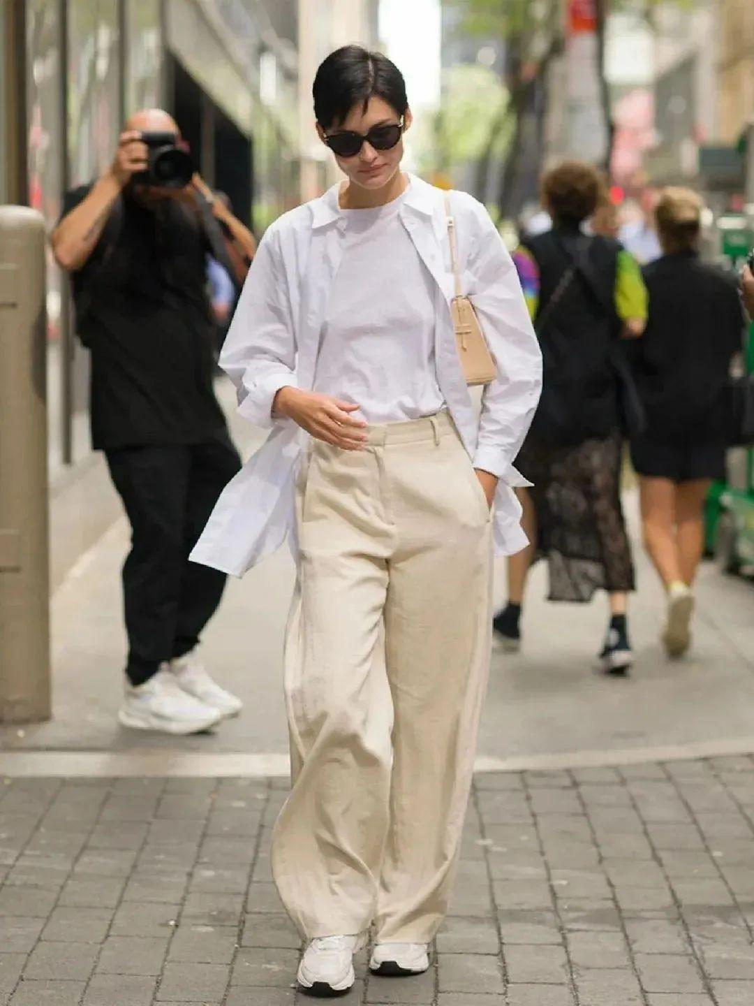 在春夏季節,襯衫和闊腿褲的穿搭可太合適了,它們之間的碰撞可是很時髦有型的,而且也非常顯氣質。