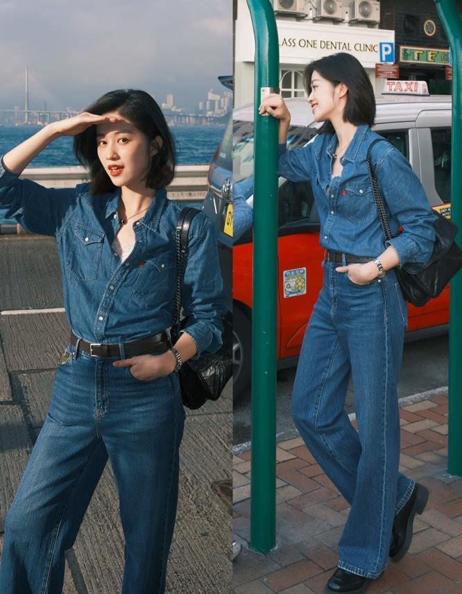 可以穿一輩子的牛仔穿搭look,整個feel就有種80後的復古風,一整套牛仔組合,牛仔襯衫+牛仔闊腿褲,用基礎款的腰帶來突出比例,簡單又不失氣質。