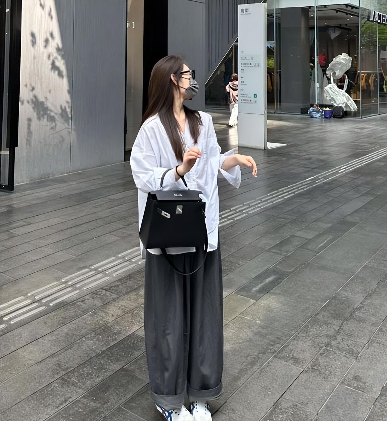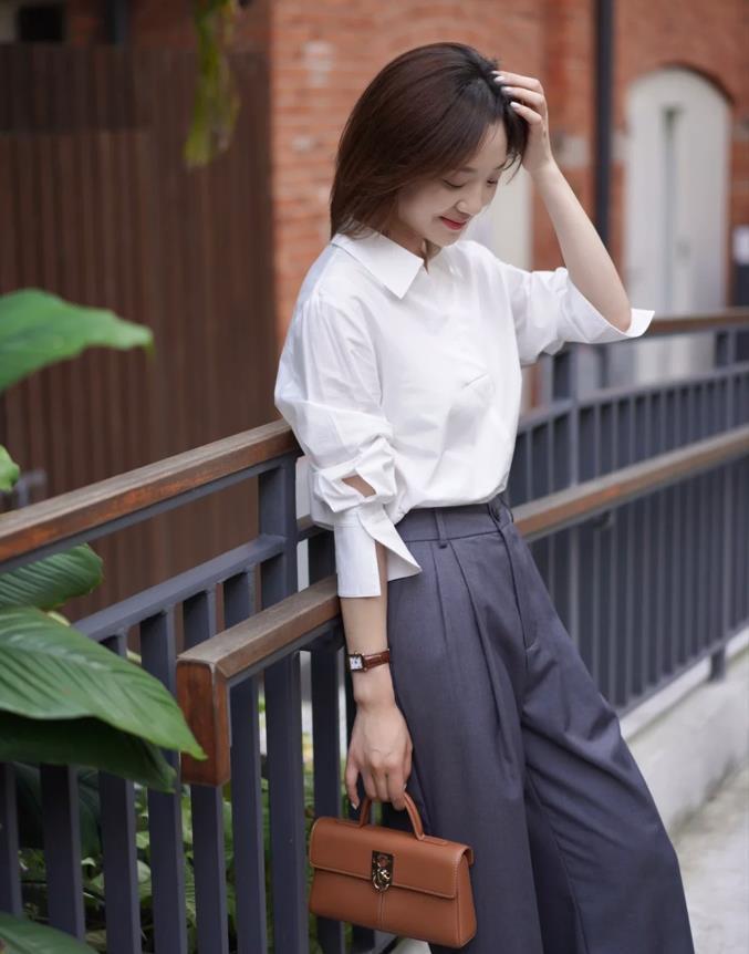 你可以永遠相信白襯衫,簡約款的白襯衣,搭配黑色西裝闊腿褲,氣質滿滿,不管是職場通勤,還是逛街都合適。高級灰的西裝闊腿褲,少了些職場的嚴謹,和正式,多了幾分日常與輕鬆休閒。
