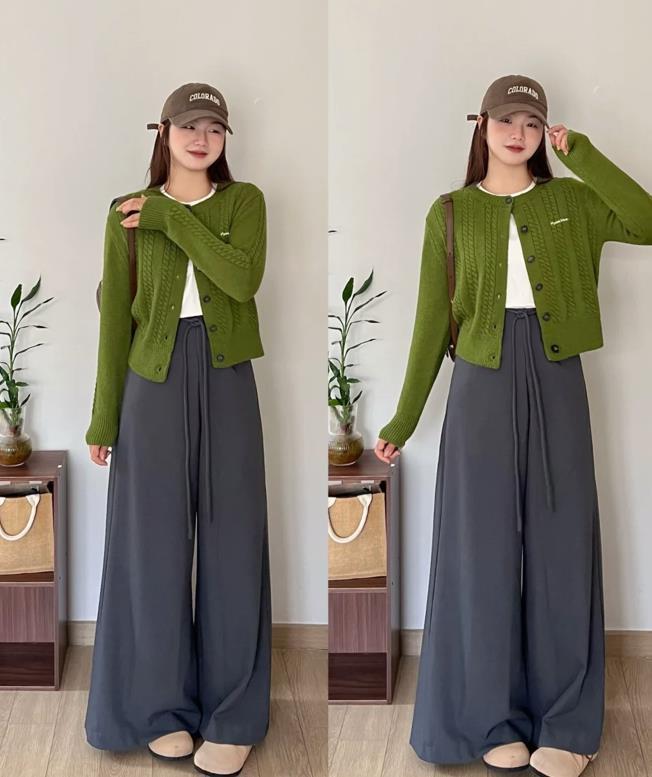 這一套可是梨形腿粗女生的本命穿搭,上短下長,上小下大的組合,我是真的好愛啊。綠色針織小短開衫,專屬於小個子女生的搭配,選擇灰色闊腿長褲,一整個顯瘦藏肉。