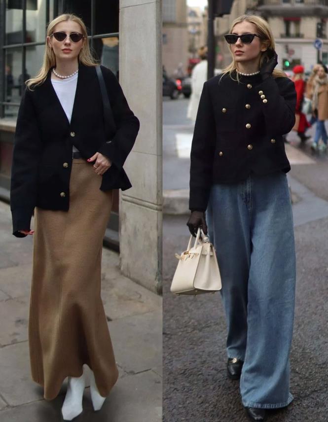西裝是嚴謹和顯正式的沒錯,但寬鬆版型的西裝卻能帶給人一種鬆弛感,穿起來會更顯瘦藏肉。搭配修身的黑色連衣裙,外鬆內緊,大與小的結合,在視覺上看起來就非常顯瘦。